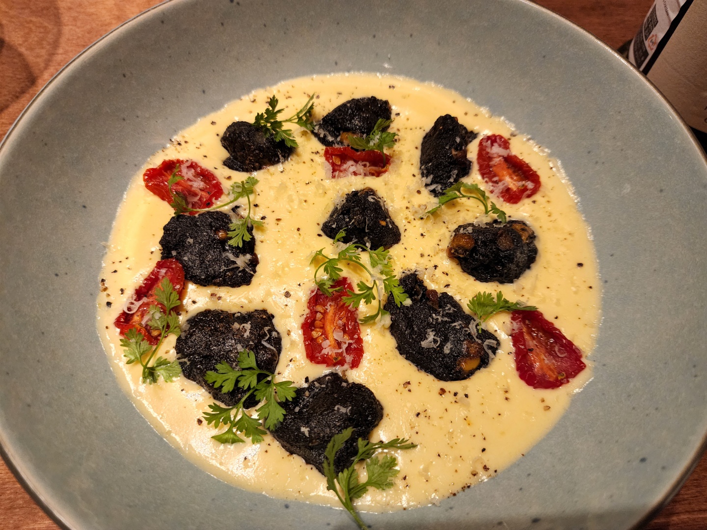 현무암 뇨끼. 먹물로 컬러를 낸 옥수수 감자 뇨끼에 말린 토마토와 체다 모르네 소스를 곁들였다.