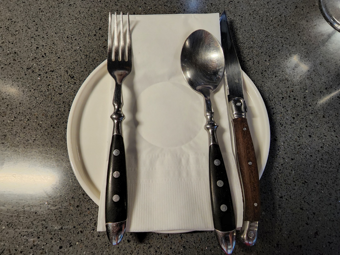 기본 세팅. 라귀올 나이프와 클래식한 포크, 스푼이 상당히 맘에 든다.