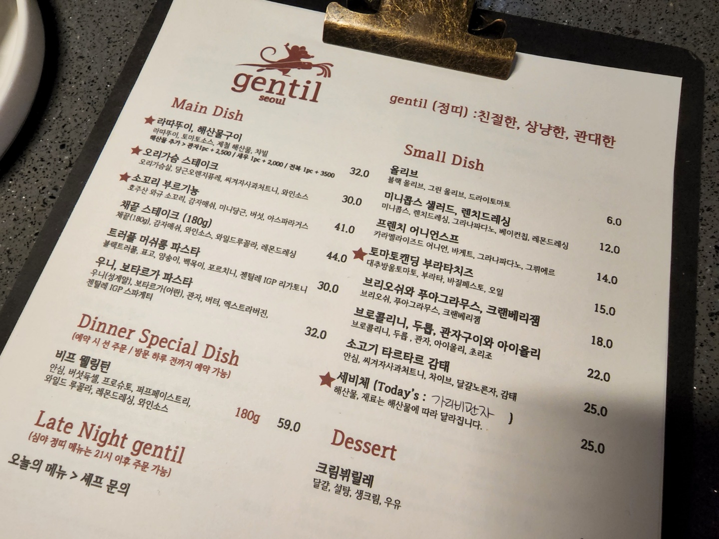작은 동네 공원 맞은편에 있는데, 유러피안 비스트로가 있을 것 같지 않은 곳에 숨어있다. 동네 주민의 아지트가 될 만한 분위기인데, 실상은 이미 유명세를 많이 탄 덕에 예약이 쉽지 않은 곳이다. 내가 방문한 날도 족히 2회전 이상 돌아가고 있더라는. 예약은 캐치테이블 앱으로만 가능하다. 인스타그램(@gentil_seoul) 참고.