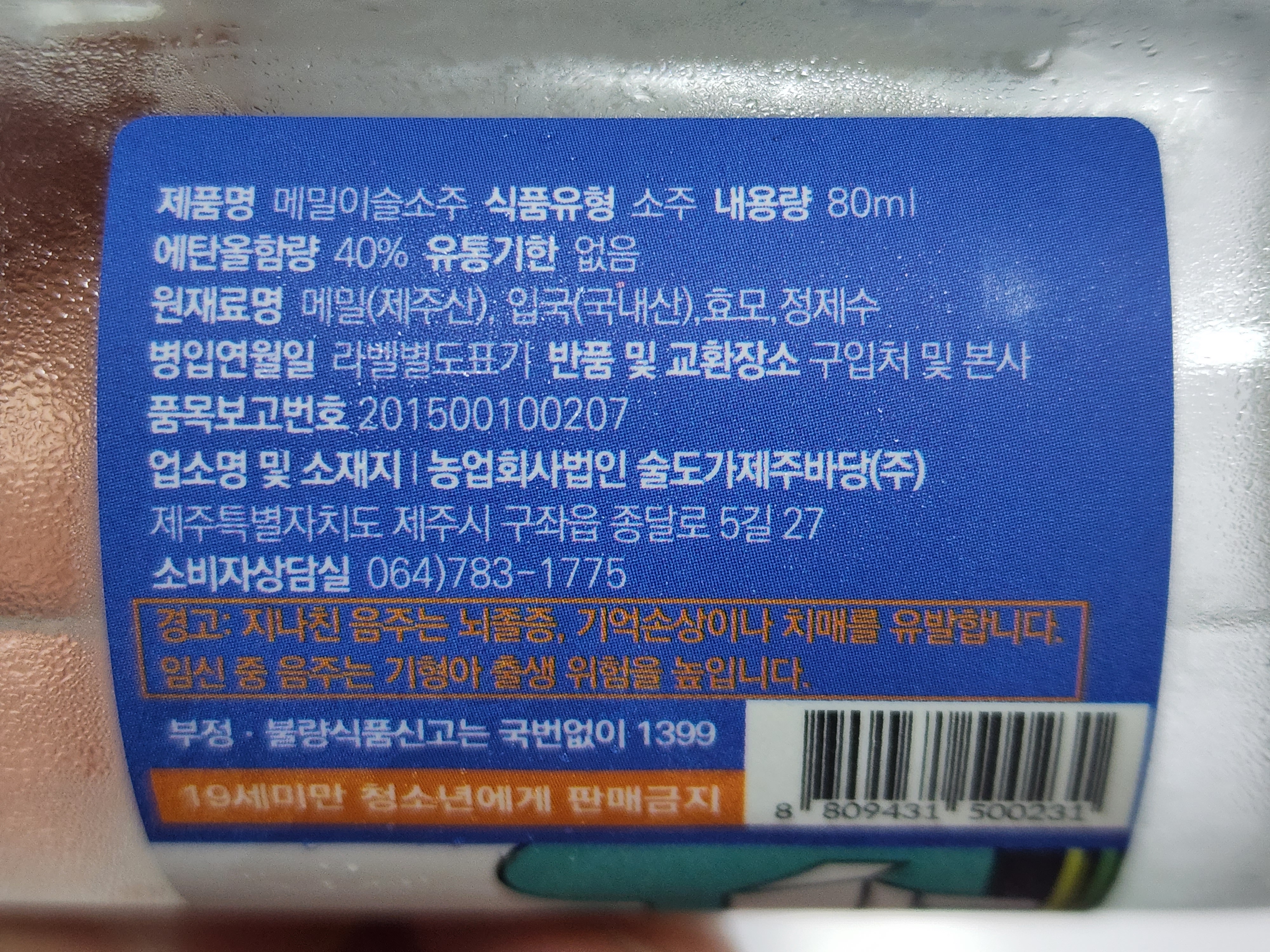 생산자는 술도가 제주바당. 원료는 제주산 메밀, 국내산 쌀로 만든 입국, 효모, 정제수.