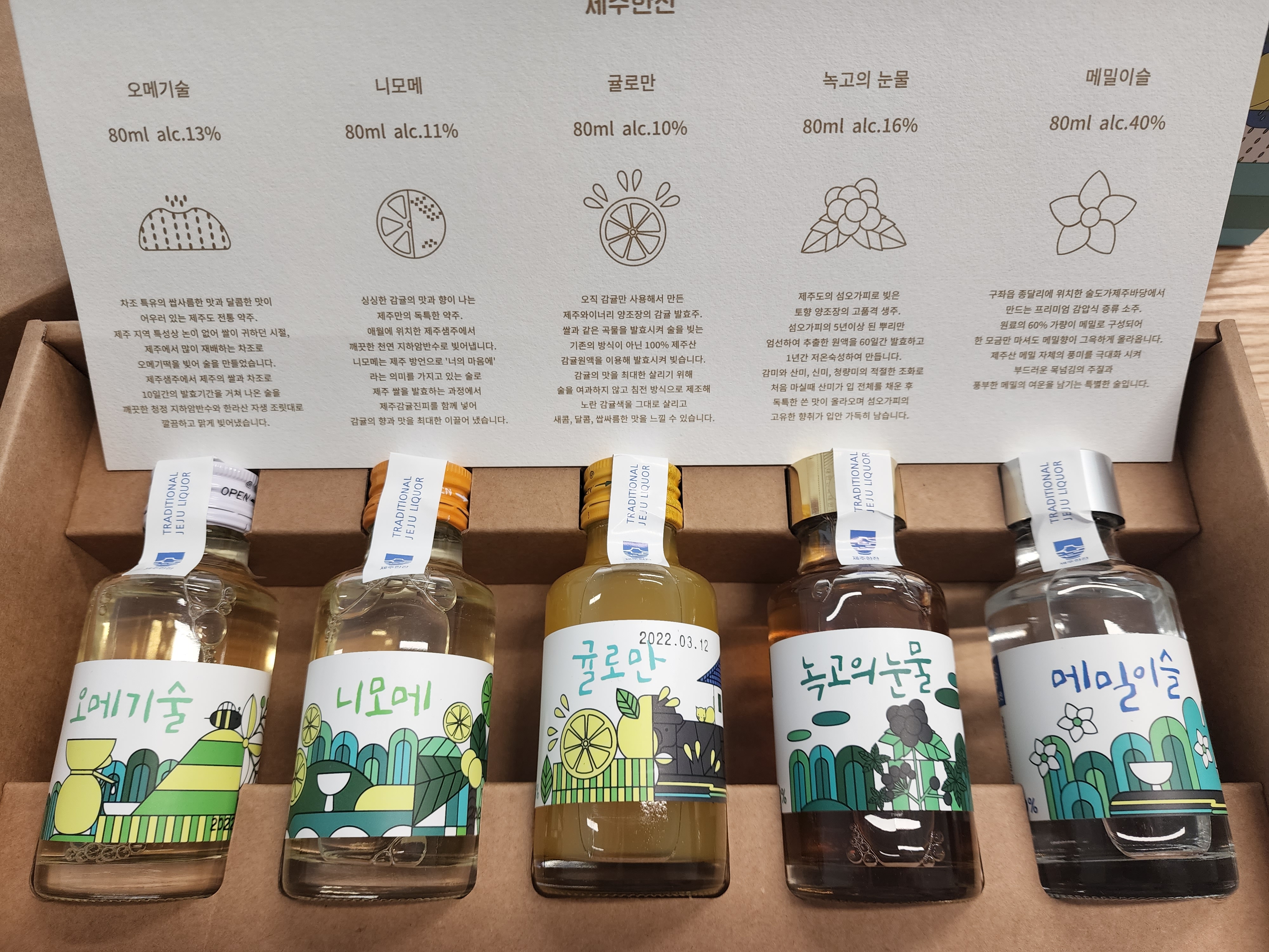 내용물은 오메기술, 니모메, 귤로만, 녹고의 눈물, 메밀이슬. 제주 특산물로 만든 양조주 4종과 증류주 1종으로 구성돼 있다.