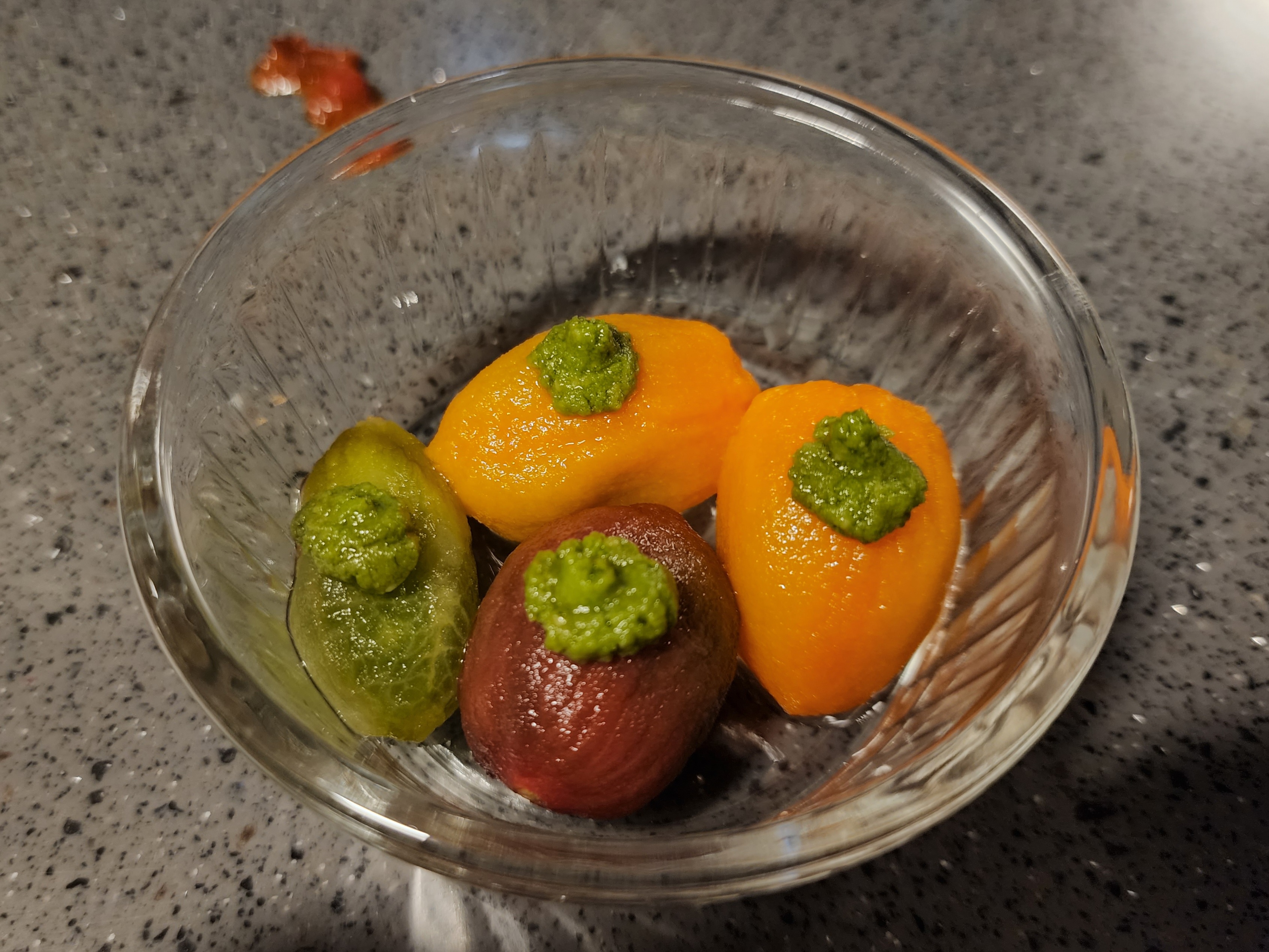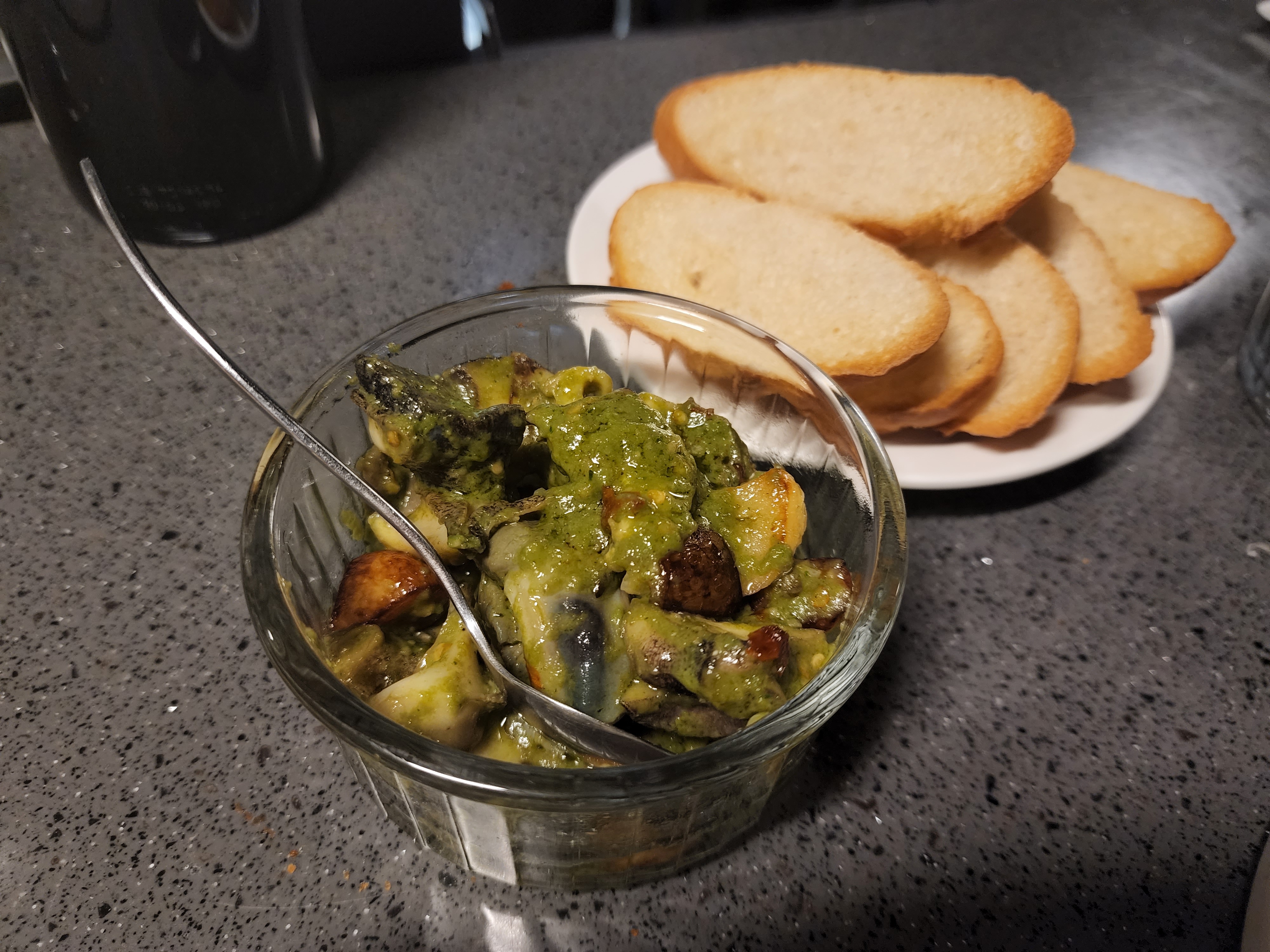 그리고 9시 이후 셰프 스페셜인 뿔소라 요리. 녹색으로 보이는 것은 소라 내장을 그대로 쓴 것인데 의외로 보르도의 드라이한 레드 와인과 충돌하지 않았다. 그렇다고 잘 어울린다고 보기도 어렵긴 하지만 ㅎㅎ 그나마 다행이었음. 근데 이럴 거면 그냥 고기 요리를 시키는 게 낫지 않았을까 싶.... ㅋㅋㅋㅋㅋ