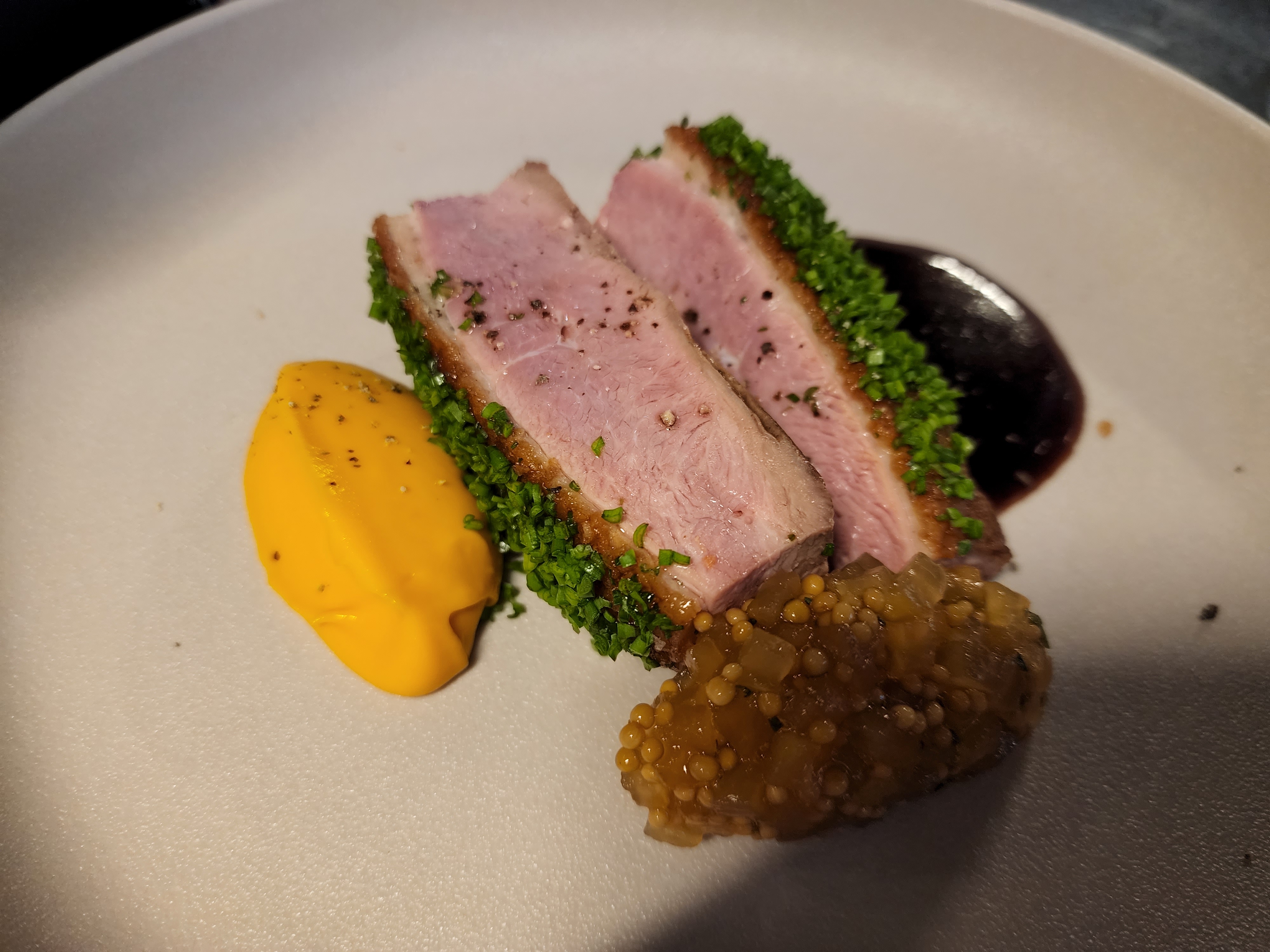 스타터로 오리 가슴살 스테이크. 가금류에 핏기가 도는 것을 선호하지 않는 보통 한국인의 입맛에 맞게 굽기가 적당하다. 곁들여 먹는 세 가지 소스의 조화 또한 훌륭.