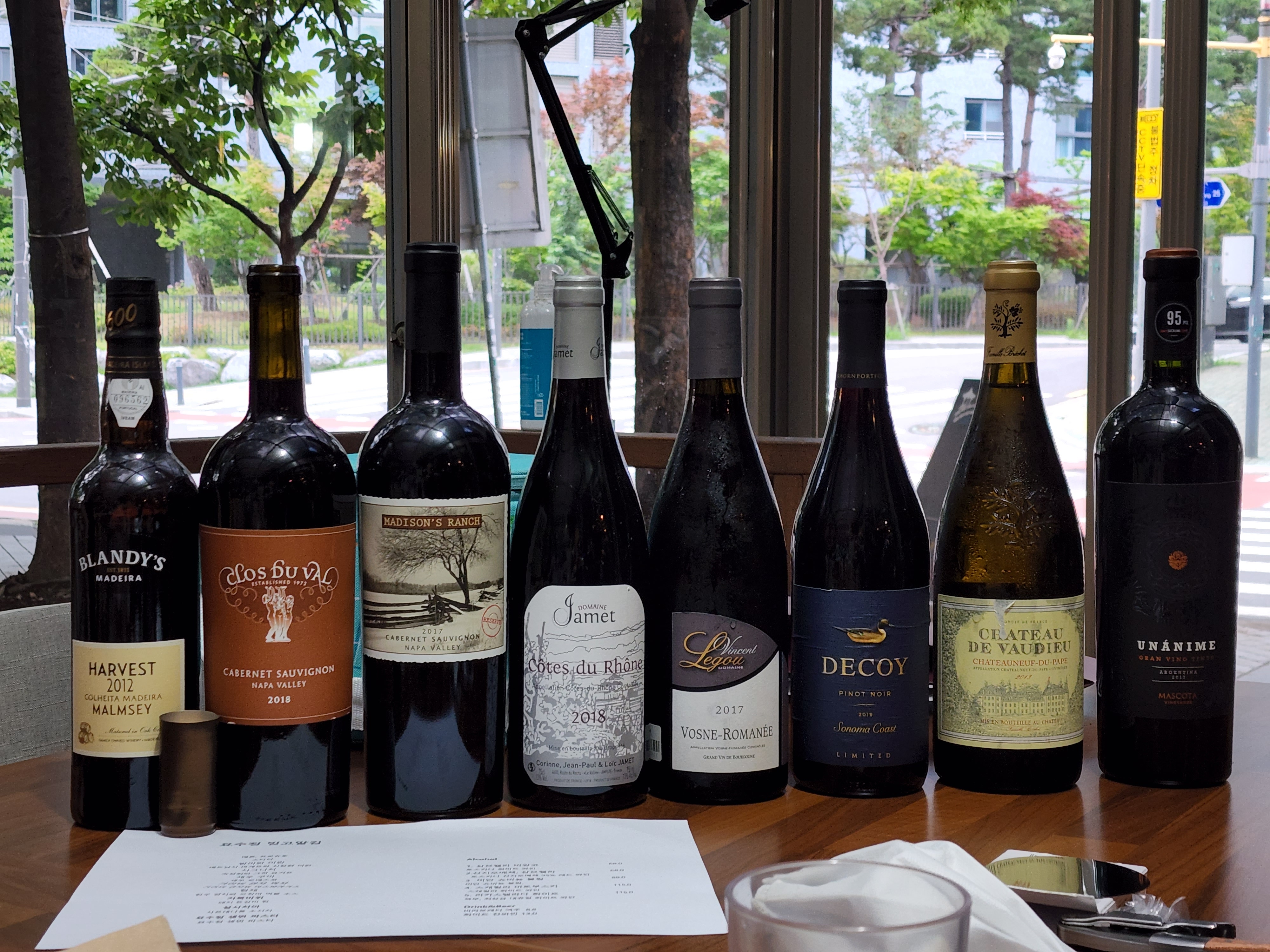 오랜만에 요수정 모임. 해도 지지 않은 시간에 와인병 쭉 도열해 놓고 시작하는 이런 모임이 너무 그리웠다.
