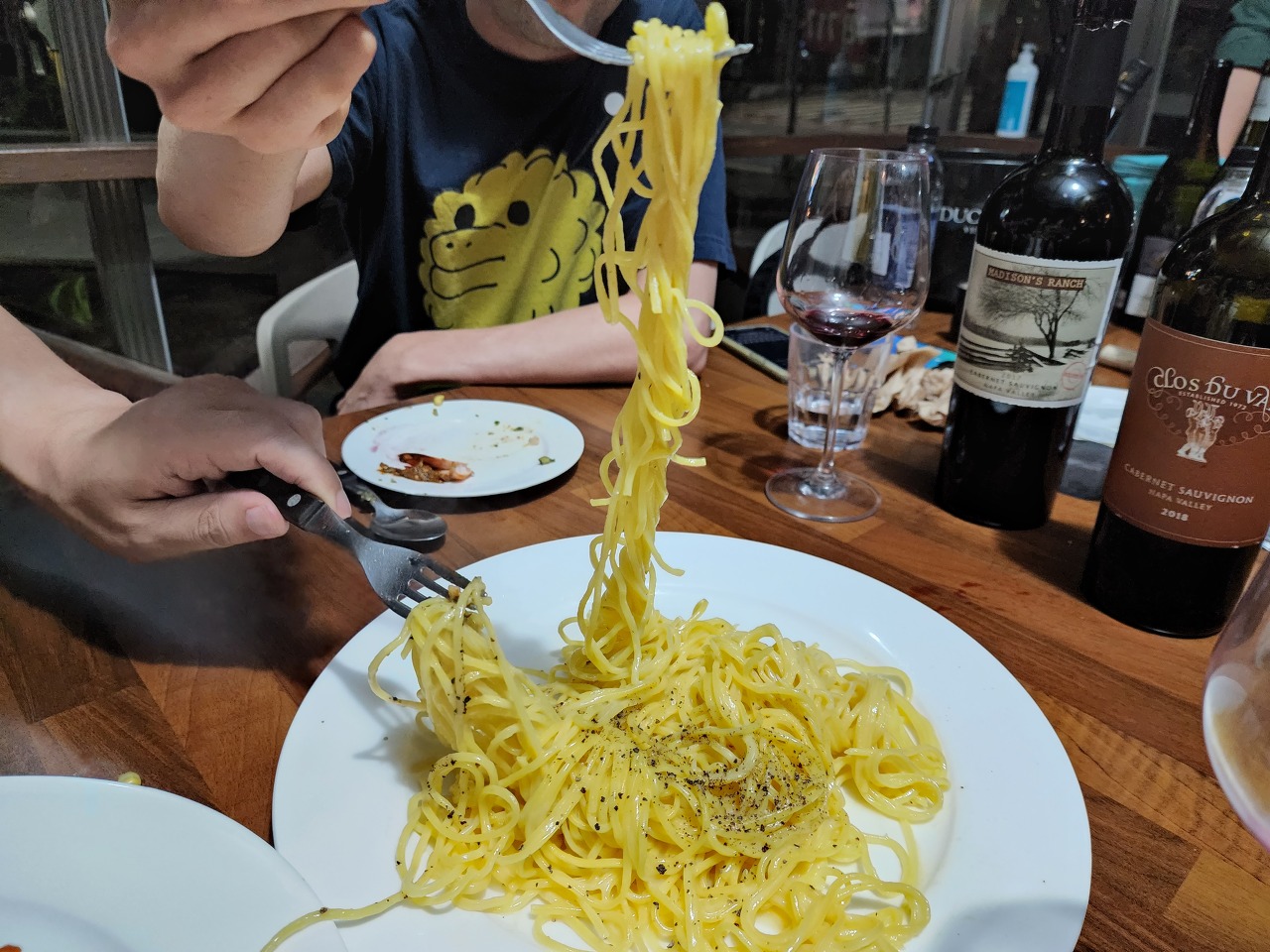 요수정 생면 파스타. 원래는 생면으로 하셨던 것 같은데, 건면도 충분히 매력있다. 외려 마지막에 탄수화물 보충용 & 안주로 먹기에는 더 나은 것 같기도.