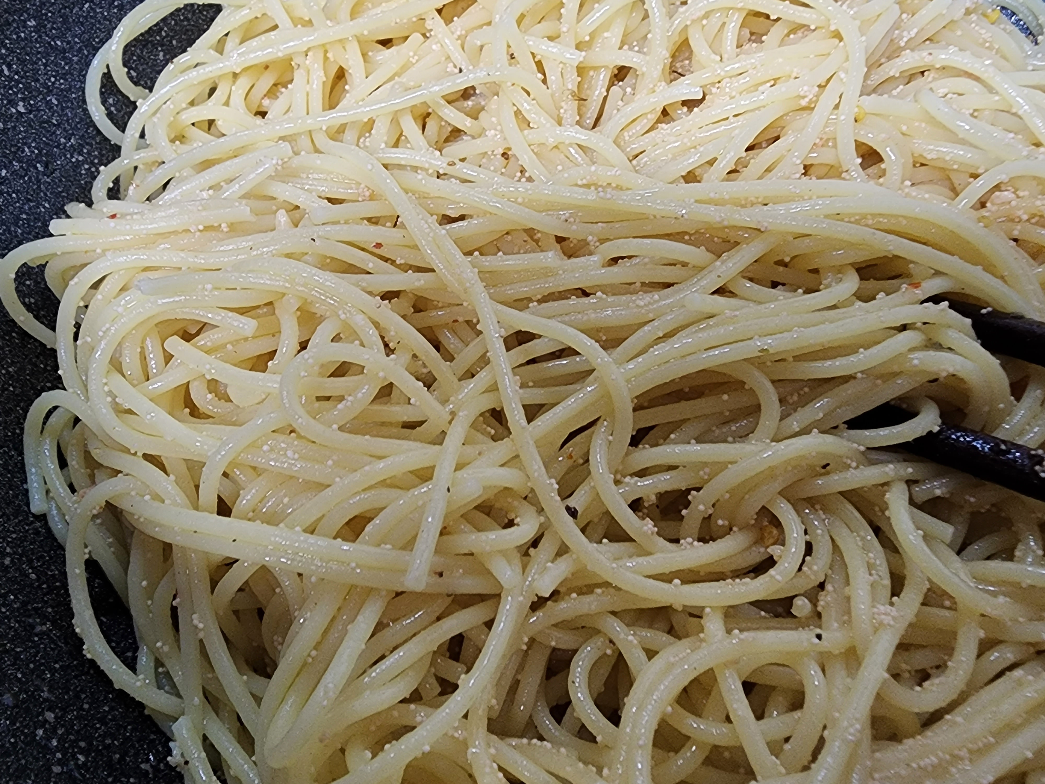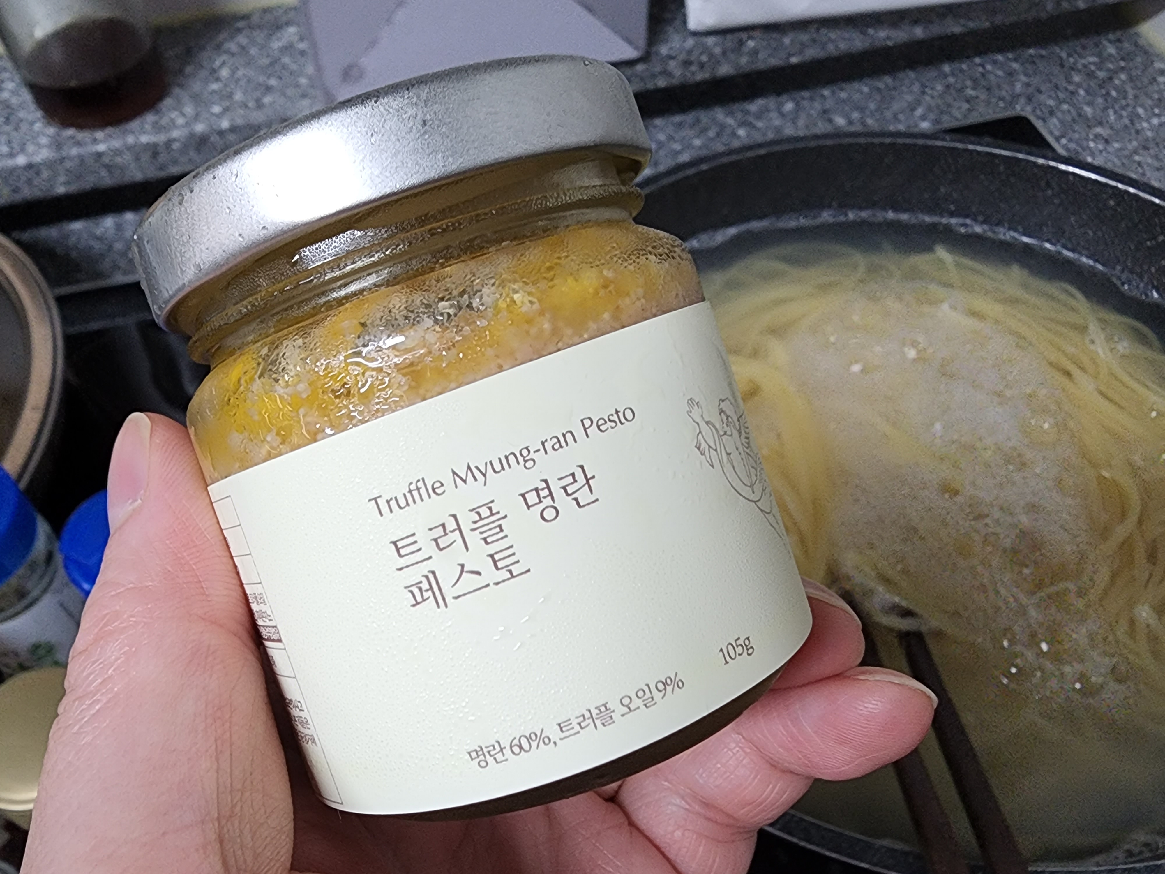 파스타는 일반 스파게티보다 살짝 가는 스파게티니 면 끓여서 위크위크의 트러플 명란 페스토를 섞어 간단히 완성했다. 이 정도면 거의 라면 수준.