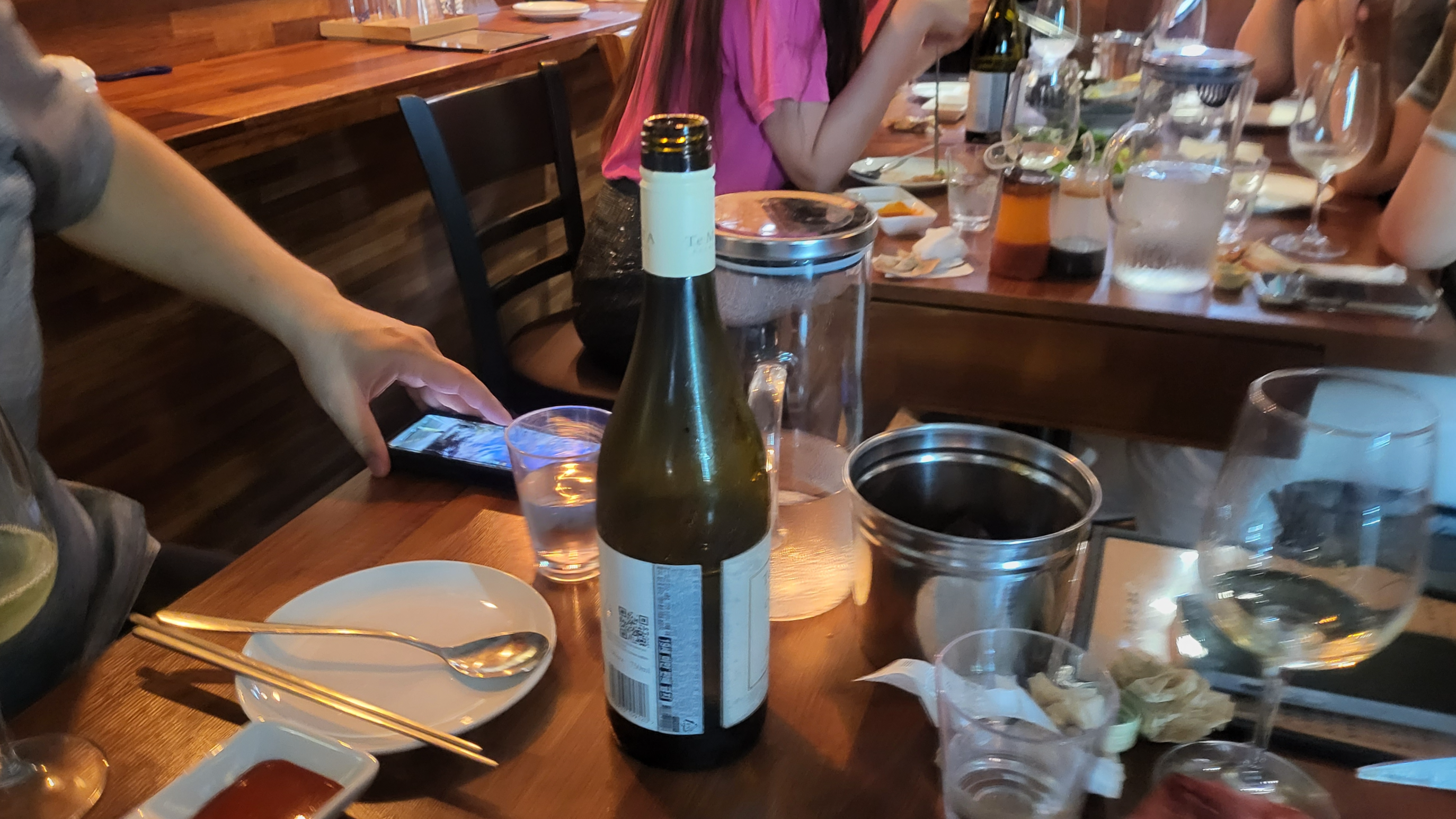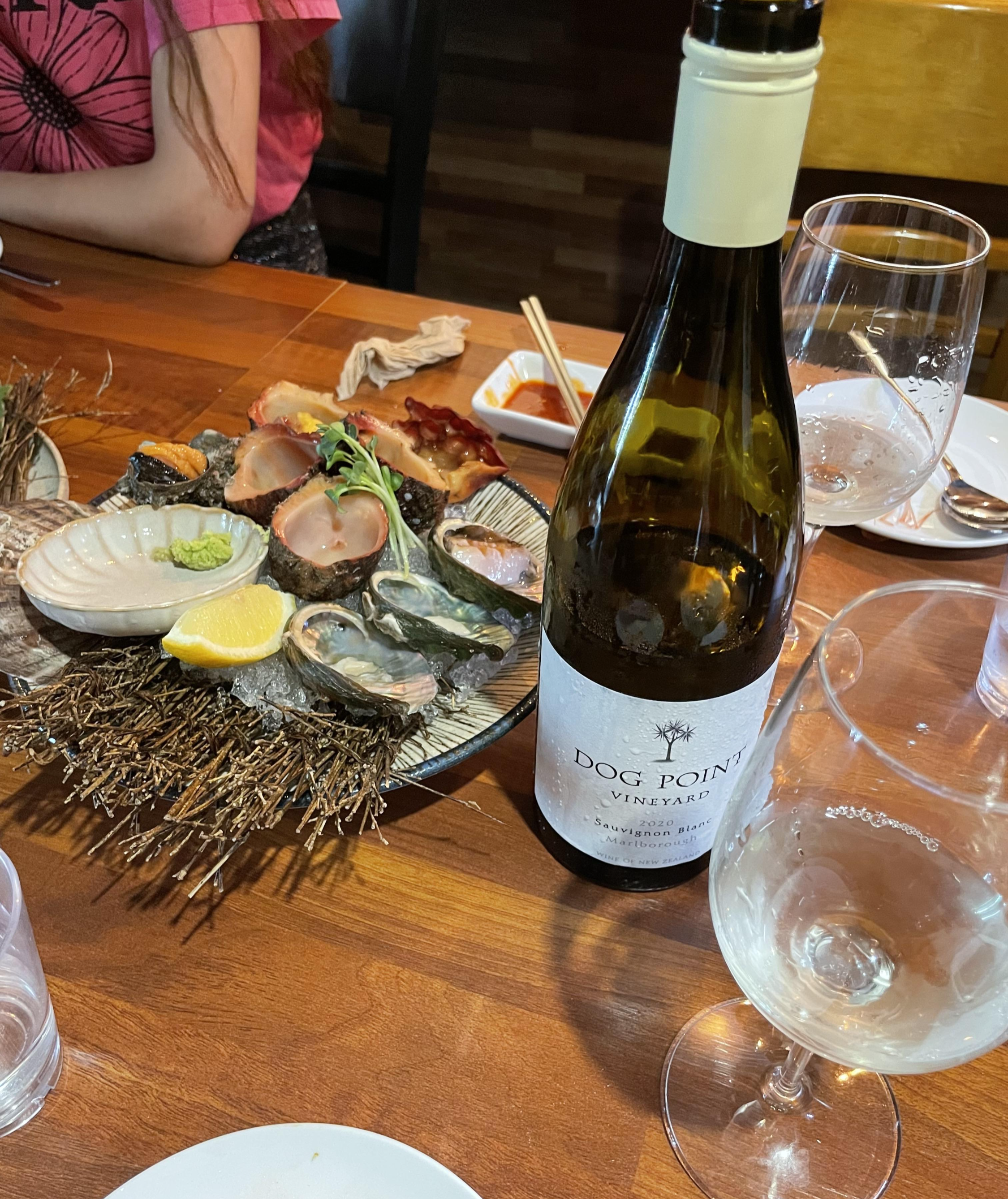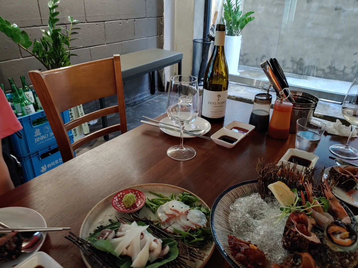 우리가 가져와 세팅해 놓은 술들. 2022년 8월 중순 기준 5.7만 원 코스를 먹으면 콜키지 프리 가능하다. 하지만 정확한 조건은 매장에 직접 전화하거나 인스타그램(@seodam_seafood) DM으로 확인하는 게 좋겠다. 와인 시음 노트는 아래쪽에 별도로.