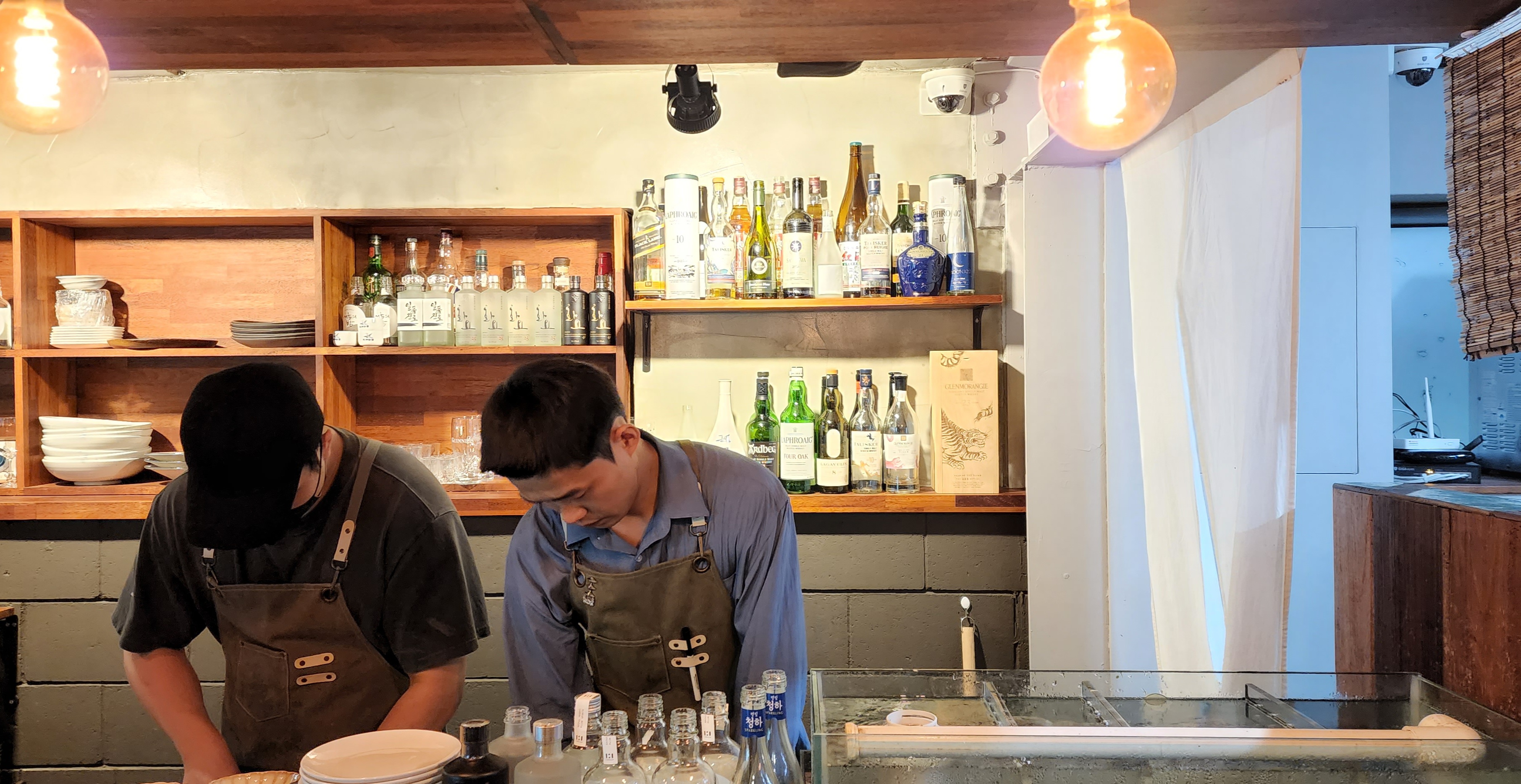 젊은 남성 세 분이 계셨는데 누가 대표님인지, 세 분이 공동운영인지는 잘 모르겠다. 어쨌거나 세 분 다 상당히 열심히 일하고 계셨음. 그리고 그 뒤로 다양한 술병들이 슬쩍 보였다. 고급 와인과 위스키 보틀이 주를 이뤘는데, 우리처럼 콜키지 프리로 이용하신 분들이 많았을 것 같다. 주인장들도 주류에 조예가 있으신 걸로 보였고.