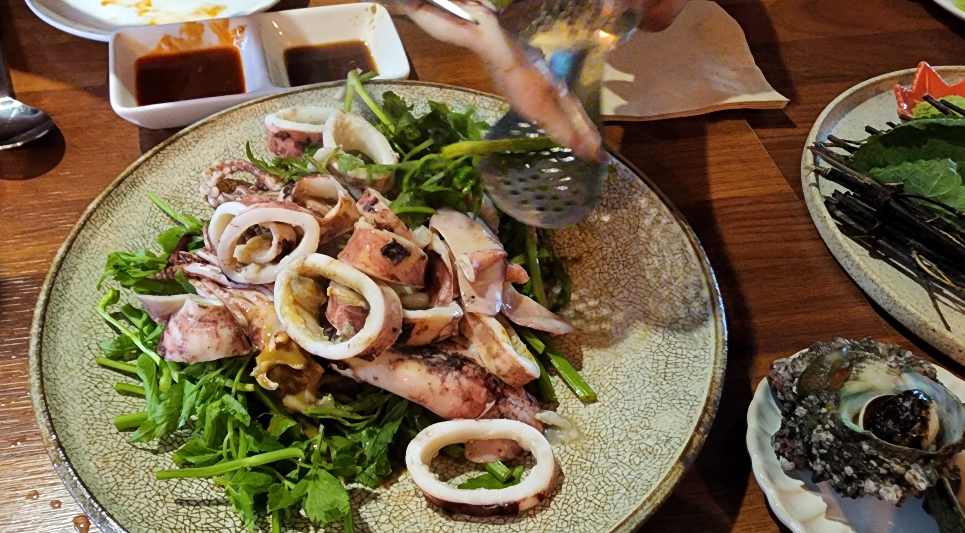 산산이 분해해서 아래 깔린 미나리랑 먹으면 핵존맛이다. 앞서 먹은 문어, 갑오징어와는 또 다른 느낌.