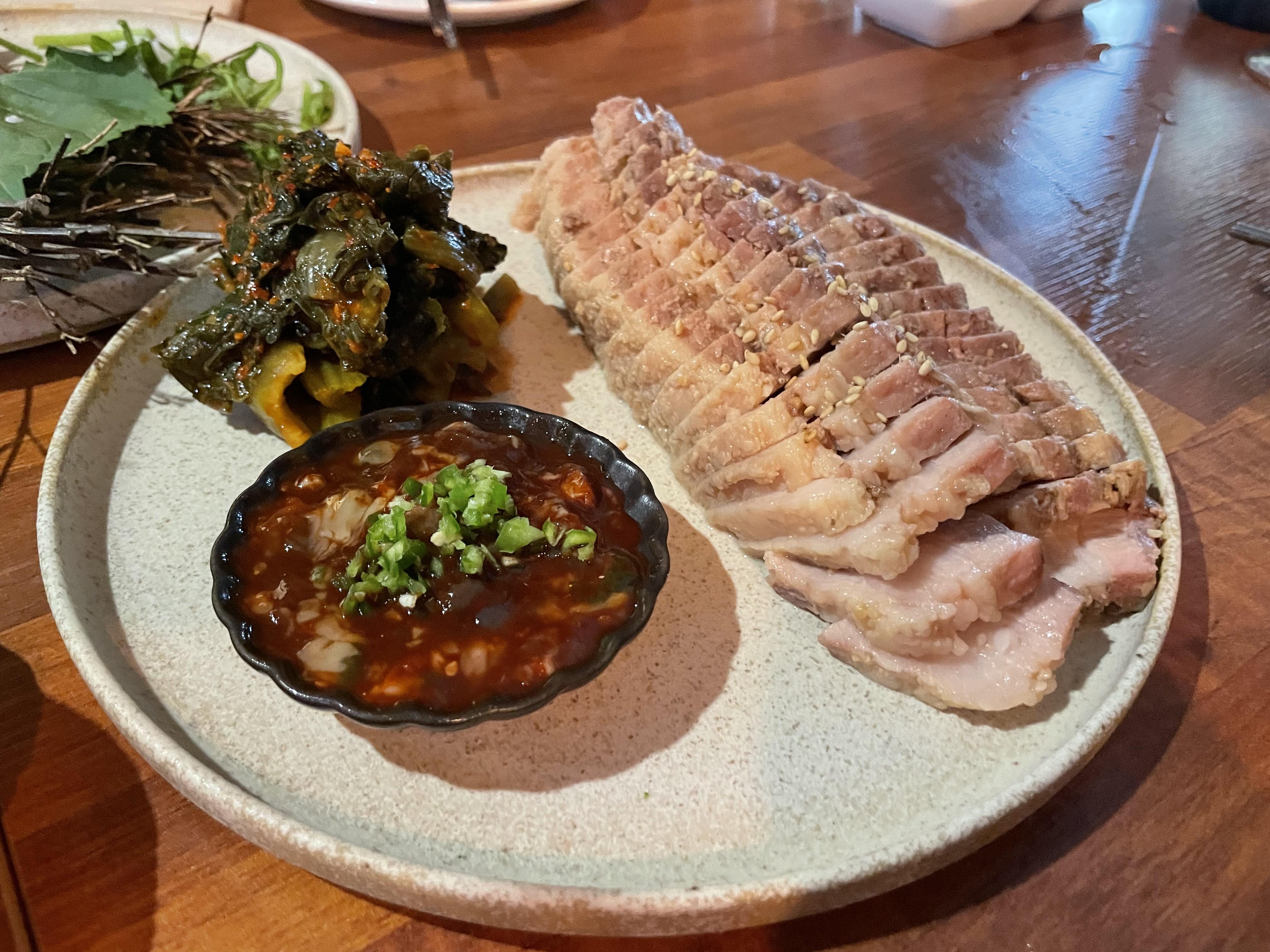유일한 육지동물이었던 돼지수육. 어리굴젓과 갓김치가 함께 나오는데 살짝 맛을 보니 와인 풍미를 다 잡아먹을 것 같아 수육만 먹었다. 소맥 먹을 땐 둘을 곁들여 먹어도 맛있을 것 같다.