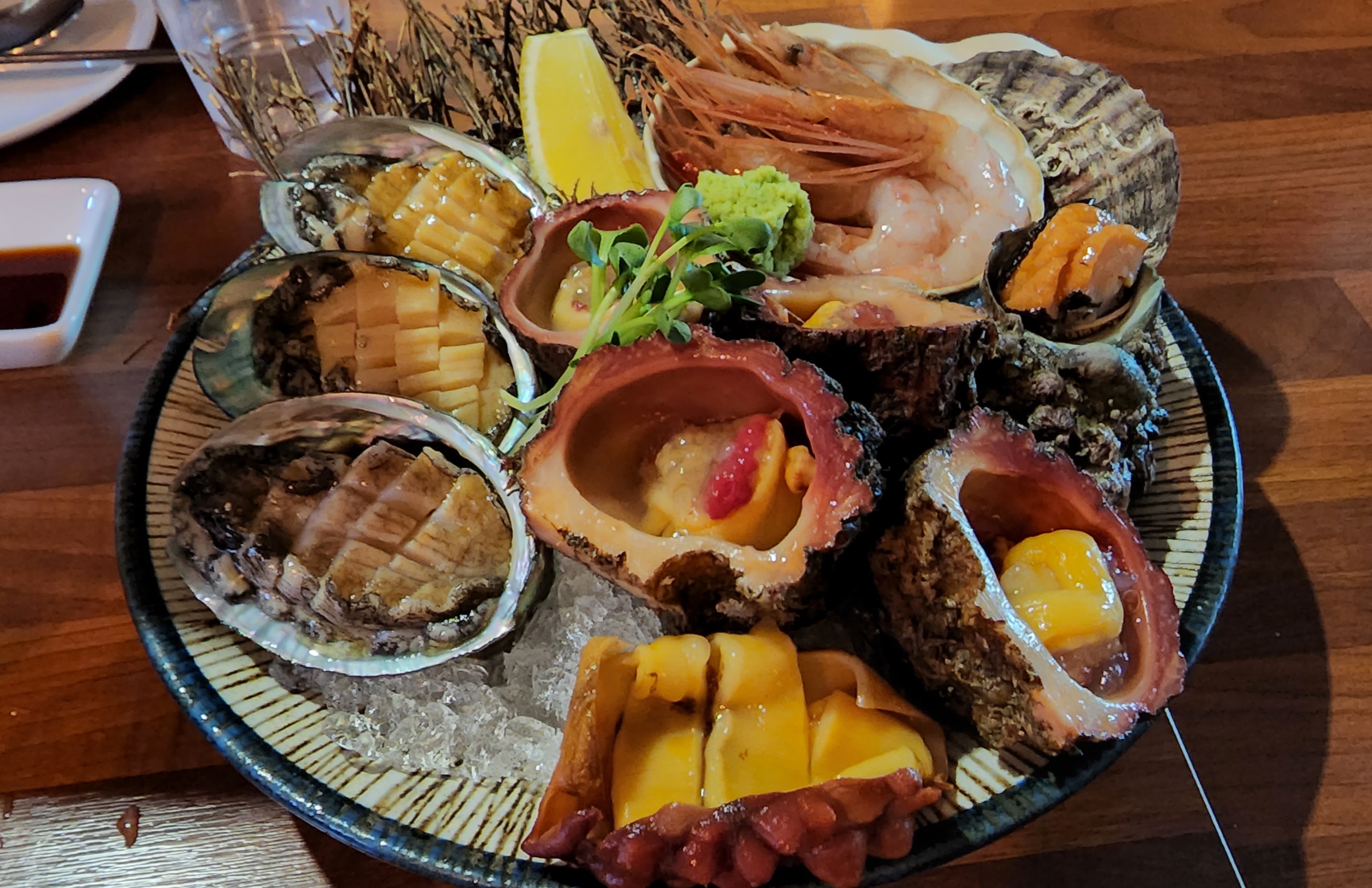 스타트는 해산물 모둠. 꽃멍게와 돌멍게, 뿔소라, 전복, 단새우. 개인적으로 꽃멍게가 가장 입맛에 잘 맞았다. 와인이랑도 잘 어울리고. 사실 생새우는 와인과 충돌하는 경우가 많다. 나야 이제 익숙해서 그러려니 하지만, 싱싱한 해산물에 화이트 와인이 안 어울린다는 사실에 충격을 먹는 분이 상당히 많은 듯.
