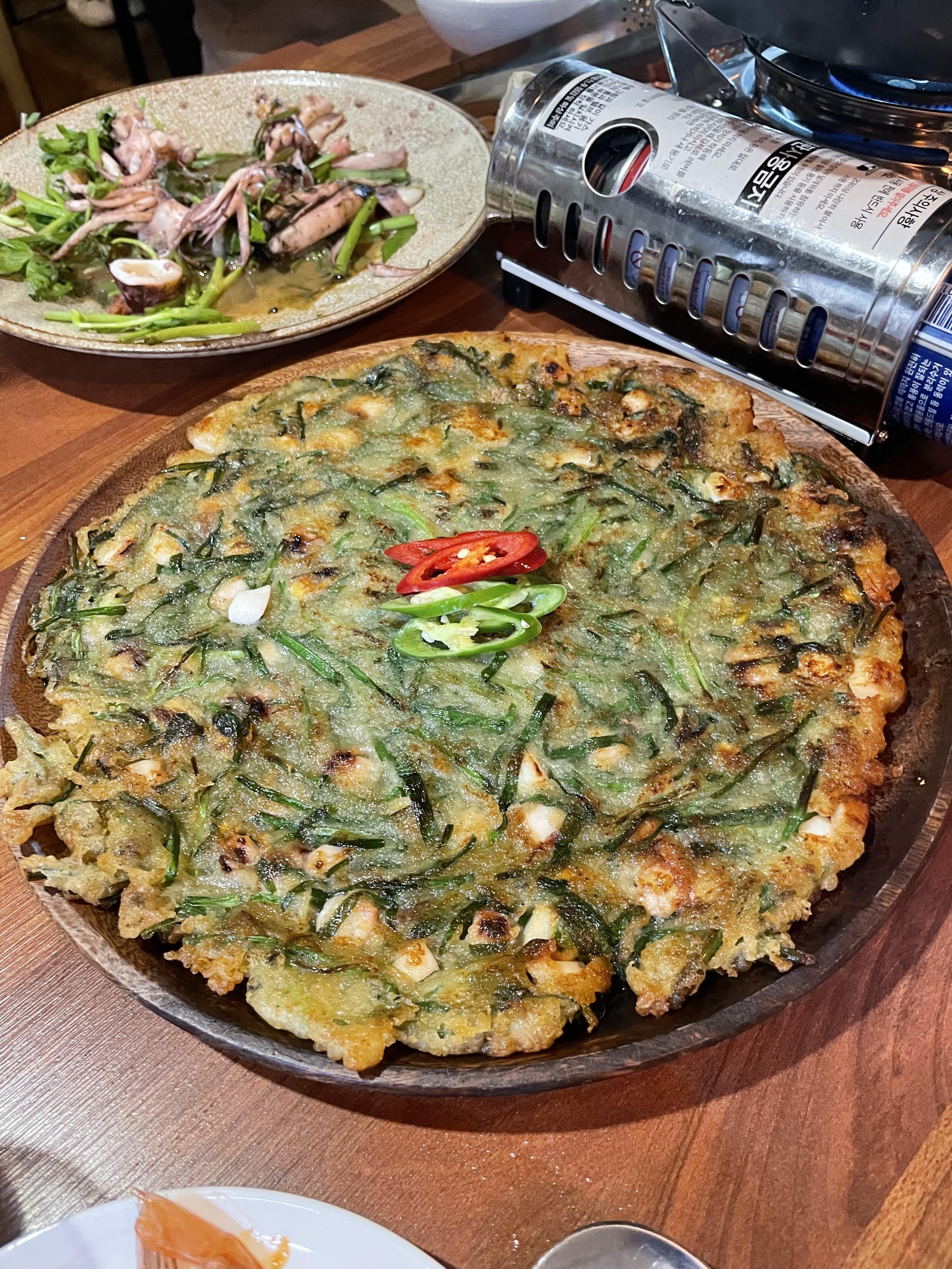 해물파전. 도톰한 데다 겉바속촉이라 아주 좋다. 해산물과 파, 밀가루 비율도 아주 좋은 듯. 매우 선호하는 밸런스 좋은 파전이다. 다음에 또 먹어야지♡