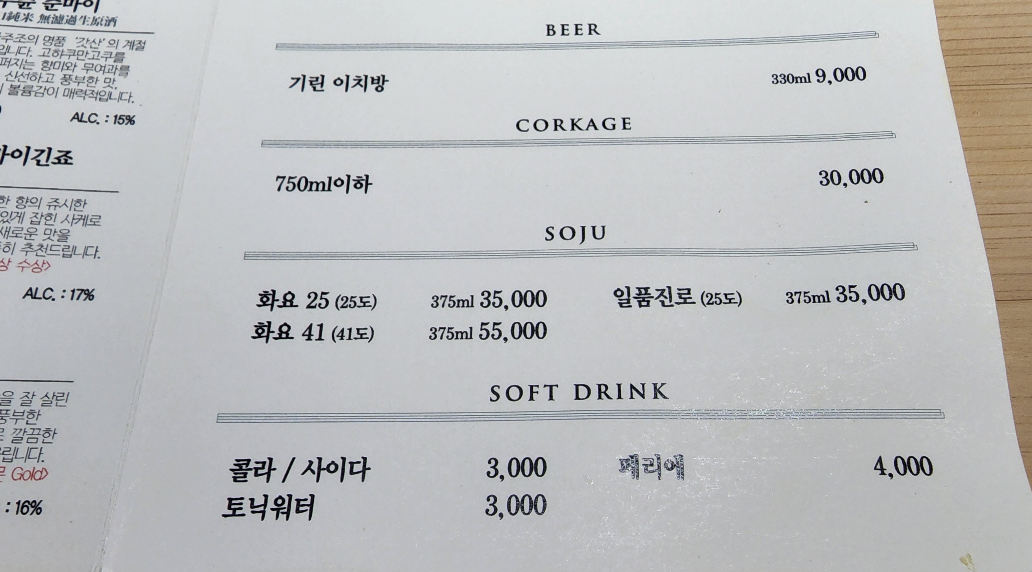 세 번째 와서야 주류 메뉴를 처음 찍어 본다.