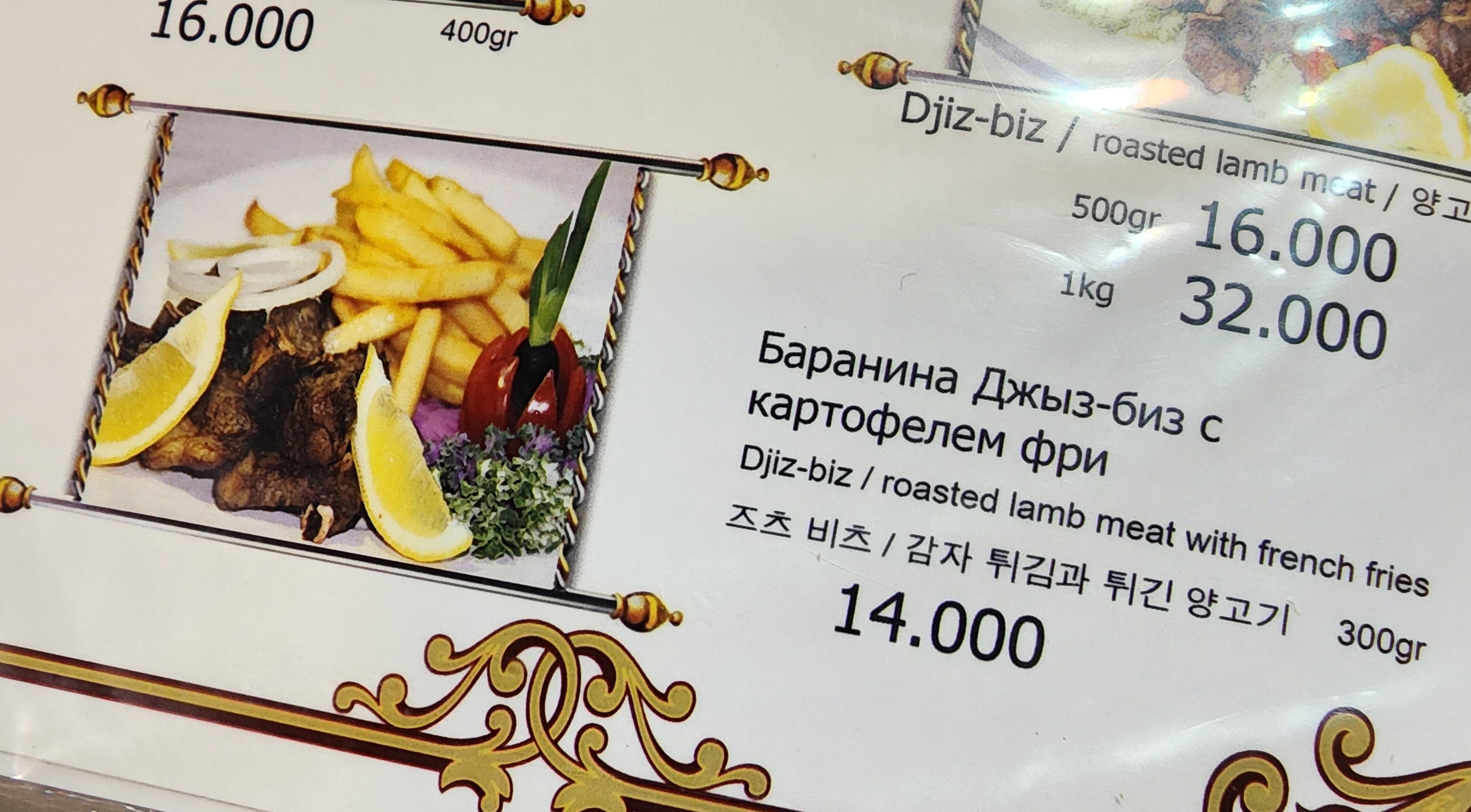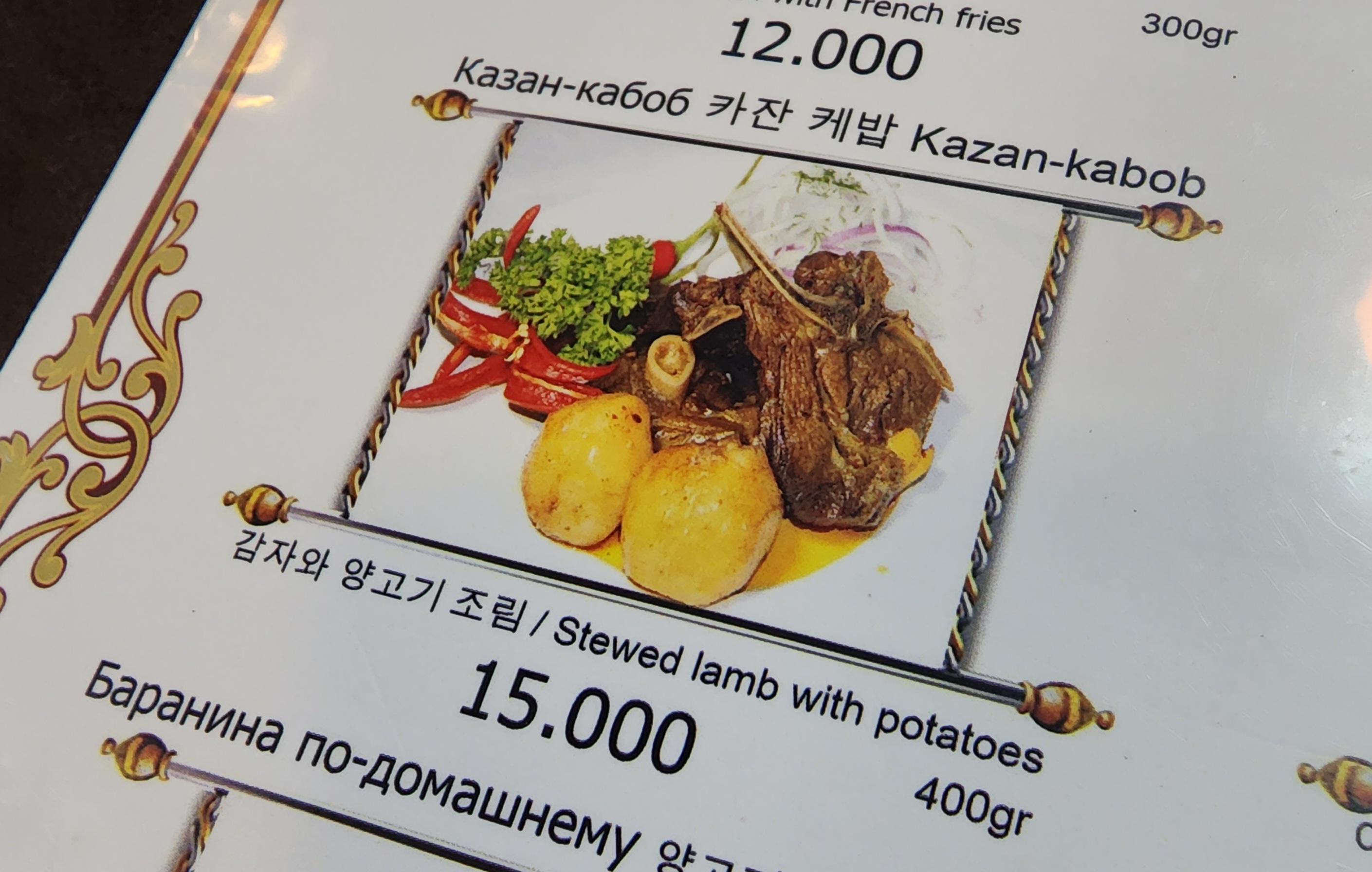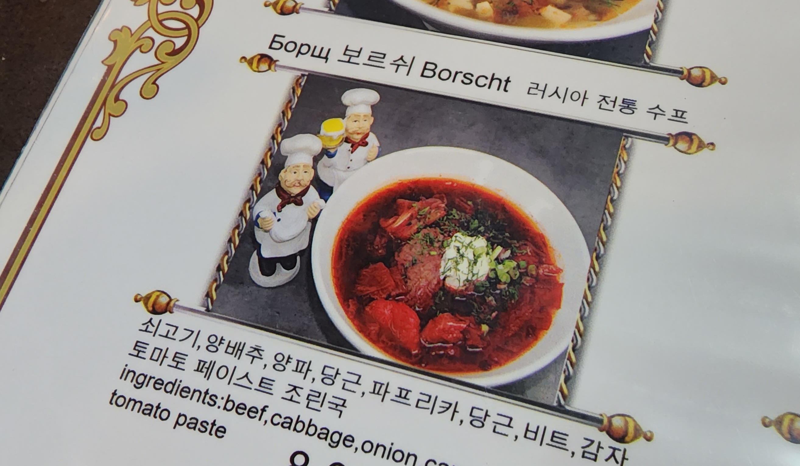 고전적인 메뉴판. 안에는 메뉴가 최소 10페이지 이상 길게 펼쳐진다. 메뉴 설명은 러시아어, 한국어, 영어도 모자라 이미지가 함께 있다. 아마 말만으로는 못알아듣는 사람이 많기 때문이겠지.