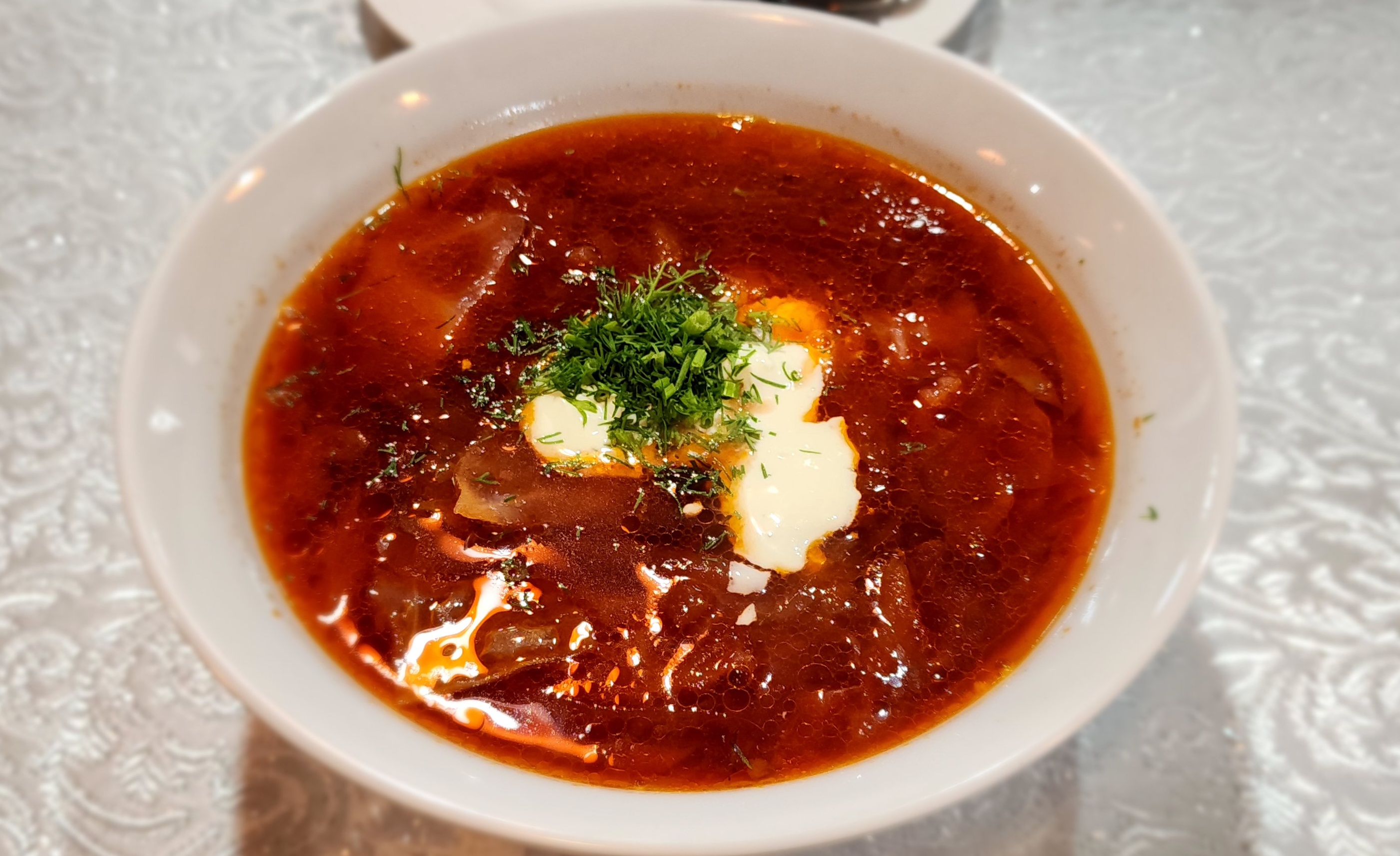 그중에서 내가 고른 것들. 러시아 전통 스프인 보르쉬. 쇠고기와 양배추, 양파, 당근, 파프리카, 당근, 비트, 감자, 토마토 페이스트를 넣은 스튜다.