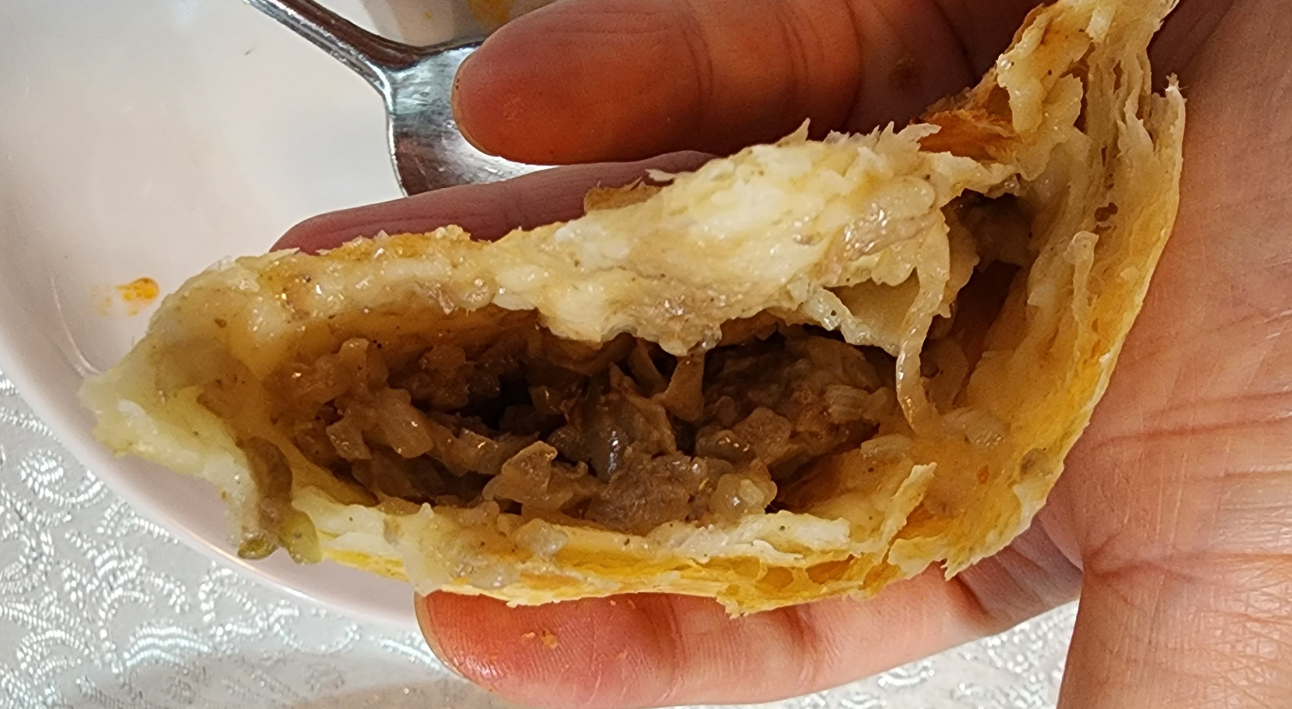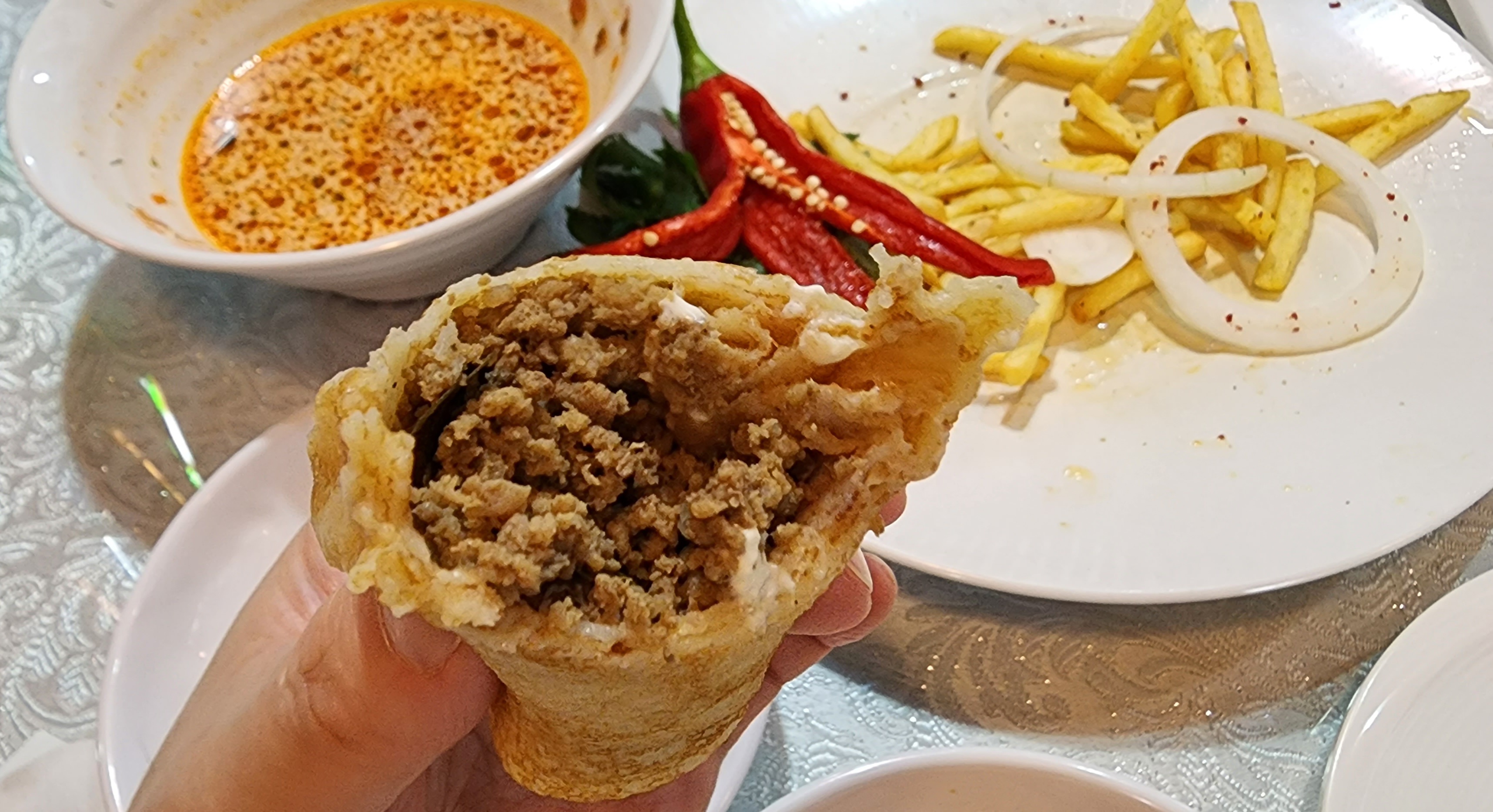 안에 갈은 소고기가 잔뜩 들어있다. 요거트 소스를 찍어먹으면 아주 맛있지만 개인적으론 바삭한 삼사 쪽이 조금 더 좋다.