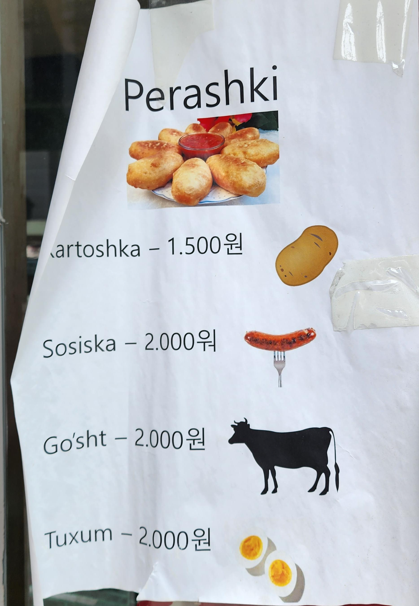페라시키(Perashki)라는 빵이 대표메뉴인 듯. 구글링을 해 보니 한글 표기가 '피로슈키'로 나온다. 러시아 전통 가정식 요리인데, 패스트푸드점이나 거리에서도 많이 파는 일반적인 음식이라고. 요걸 먹거보고 싶었는데, 없단다. 삼사도 없고.