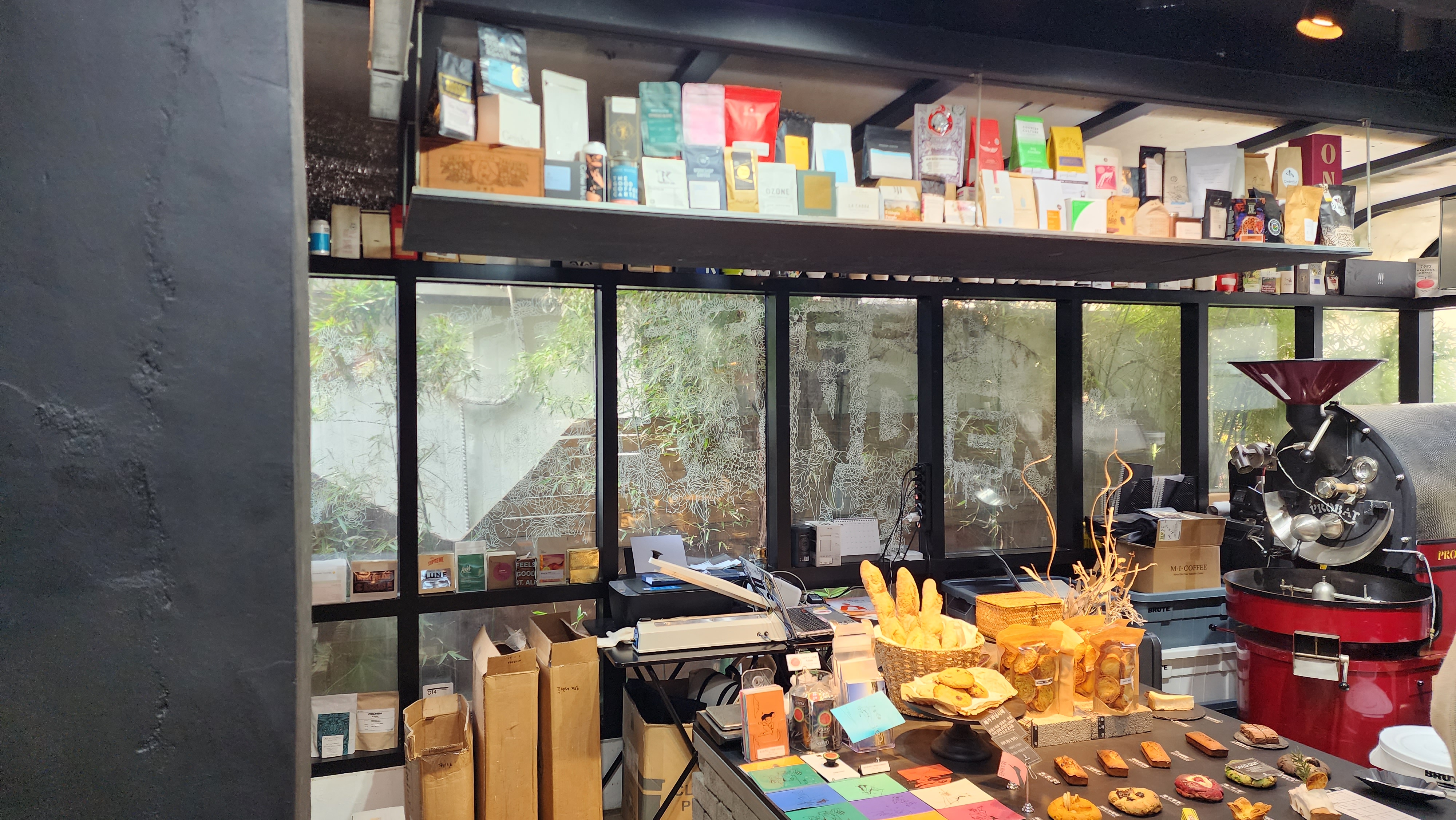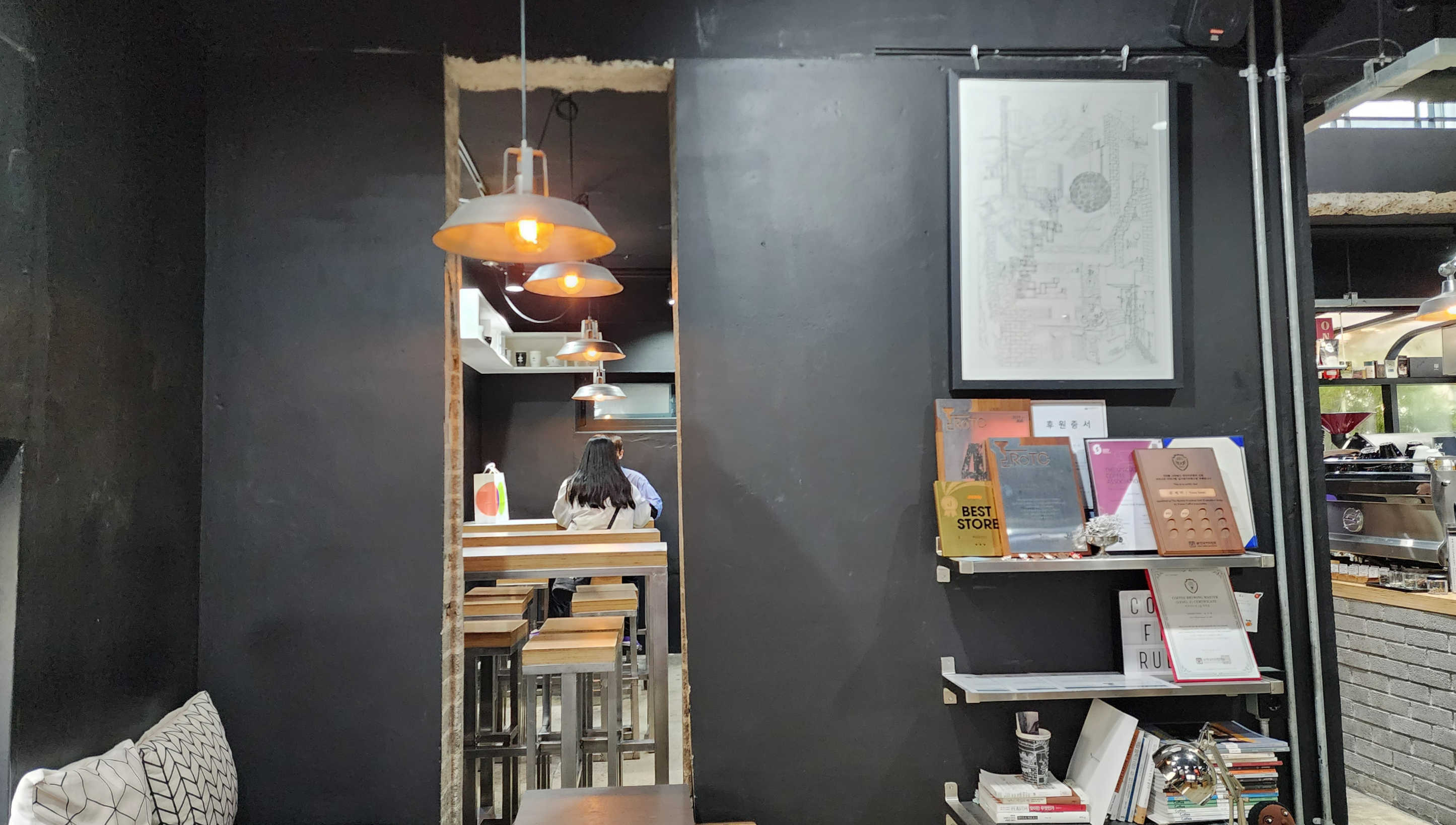 좌석 뷰. 간단히 커피 한 잔 하러 오거나, 친구와 수다를 떨거나, 과제나 공부를 하러 와도 될 것 같다. 물론 소음에 민감한 사람이라면 과제나 공부는 무리. 2층도 있는데 이미 연인들 무리로 완전히 점령돼 있었다.