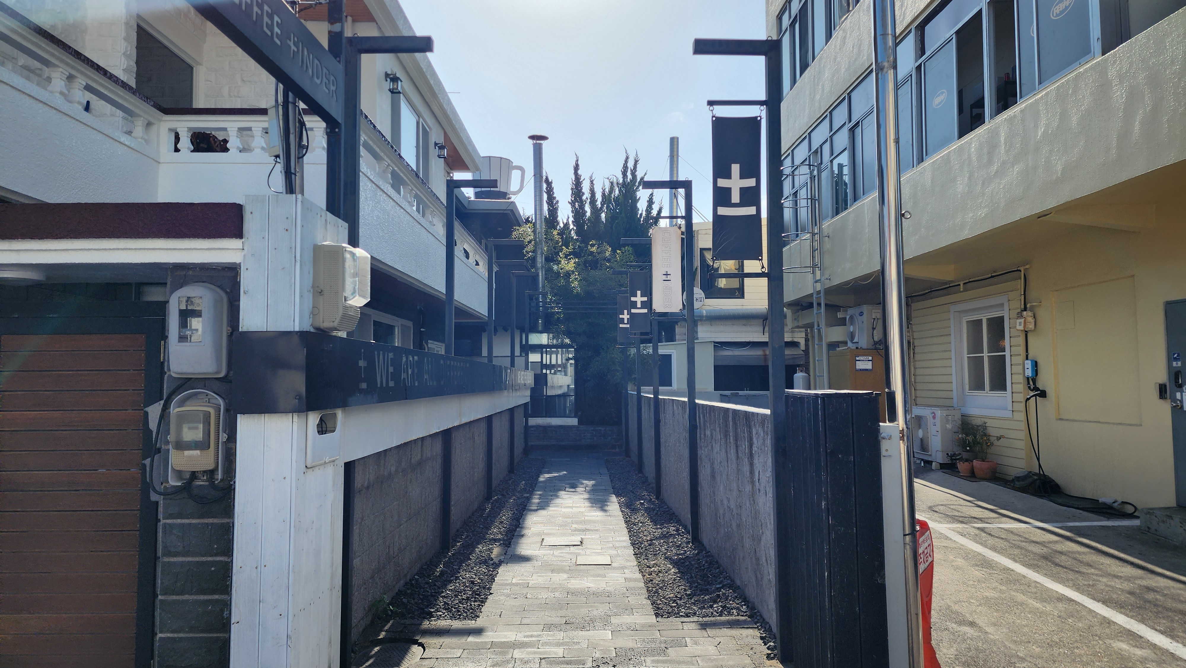 가게로 들어가려면 골목 안으로 들어가야 하는데, ± 기호들과 갖은 슬로건들이 적혀 있다. 카페 컨셉이 고객의 커피 취향을 찾아준다는 것인 듯. 플러스 마이너스 기호는 취향을 찾아가는 과정을 나타내는 상징인 것 같다.