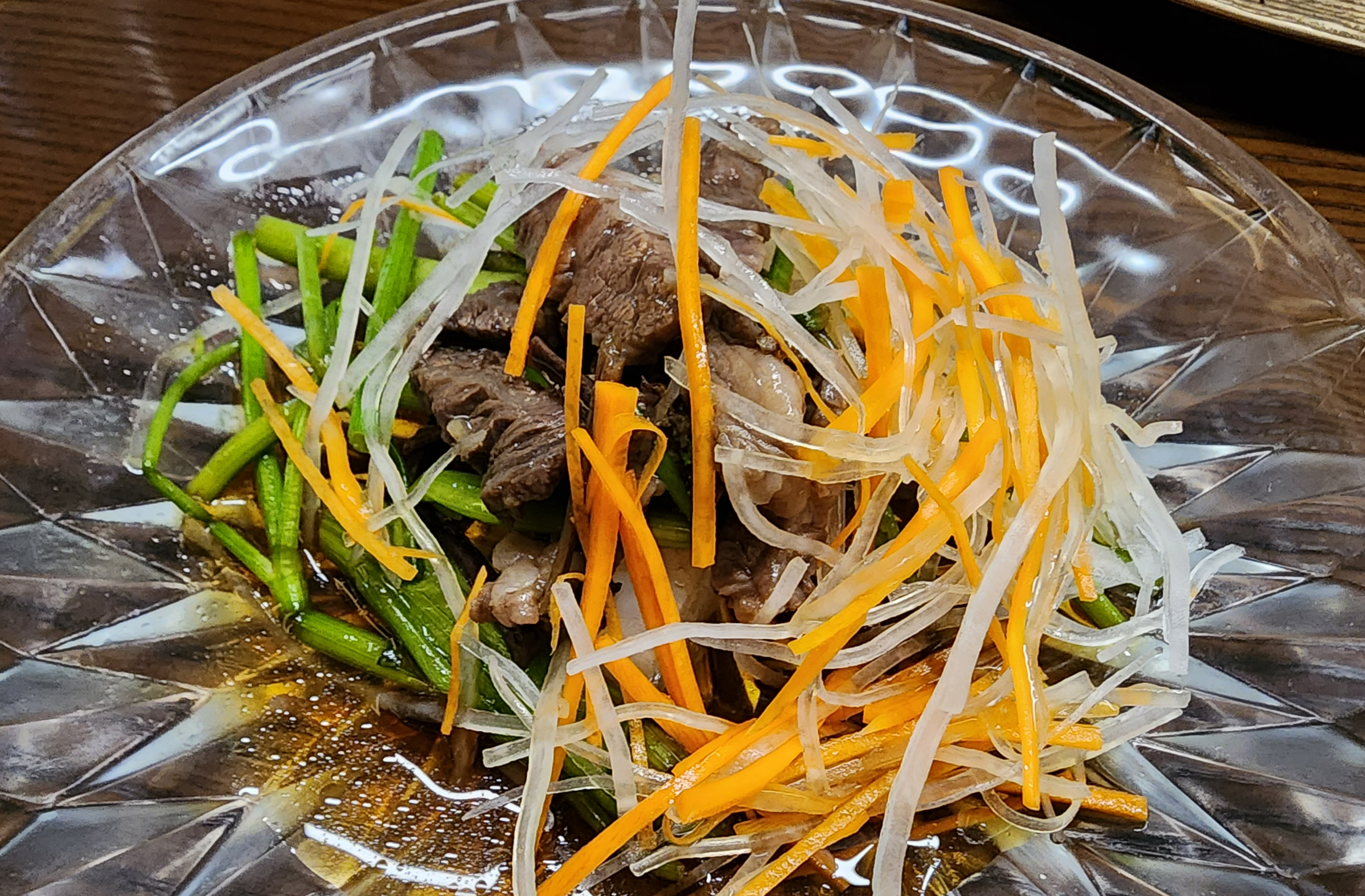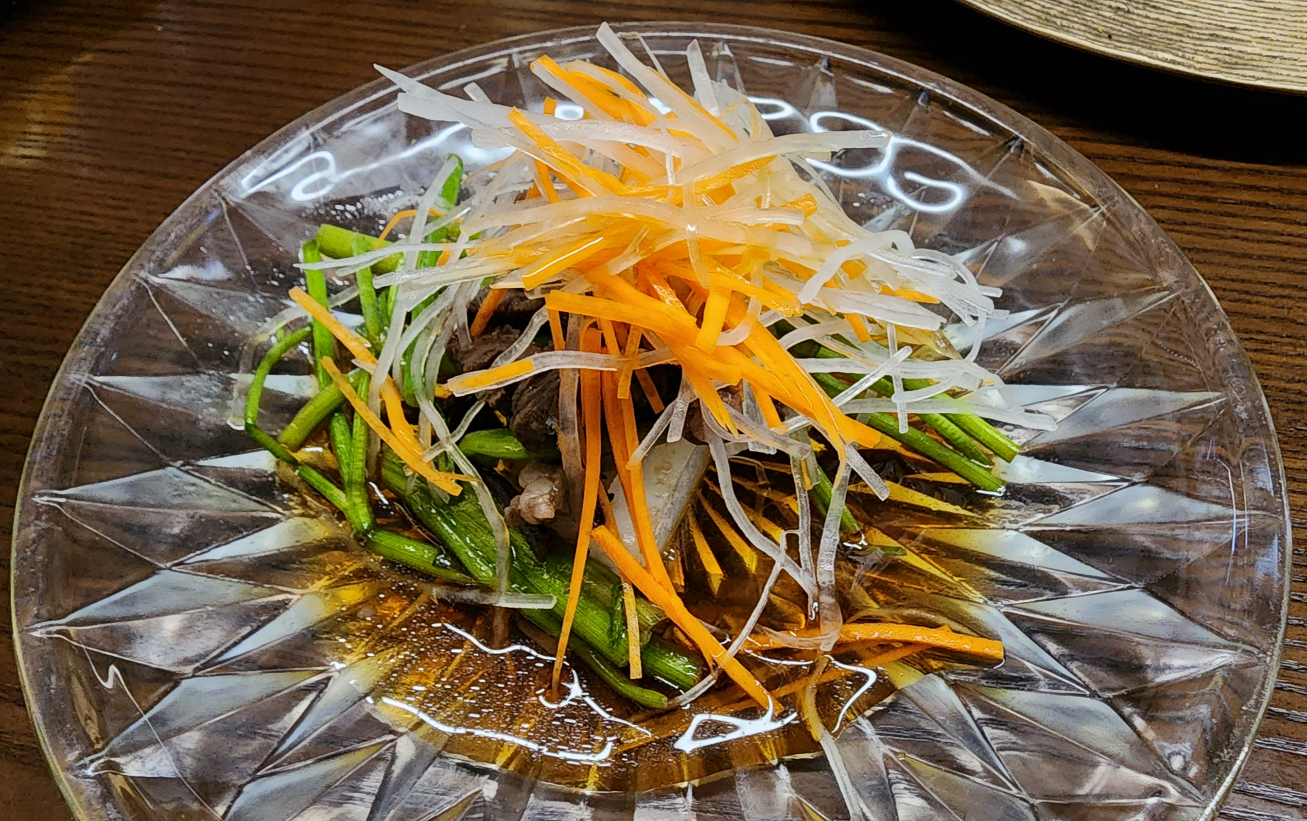 한우 2+ 미나리 잡채. 한우 등심에 직접 만든 청포묵과 미나리, 두 가지 지단을 곁들여 초간장에 무쳤다.
