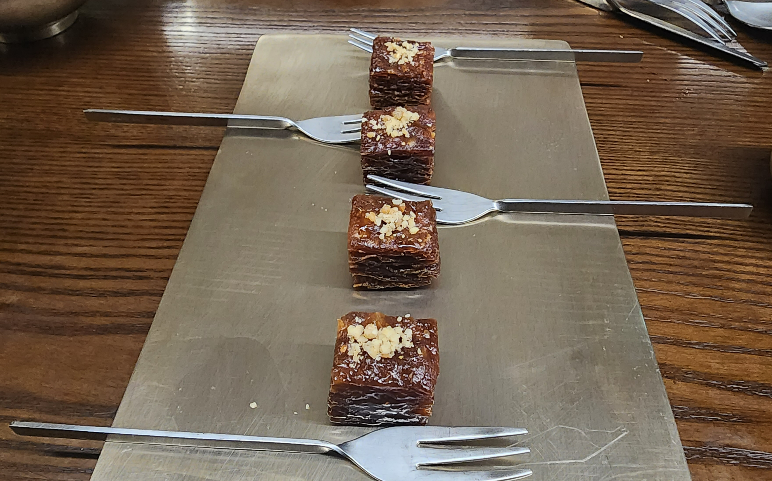 포크로 살짝 누르니 꿀 떨어지는 거 보소. 조그만 한 조각에 맛이 집약돼 있다.