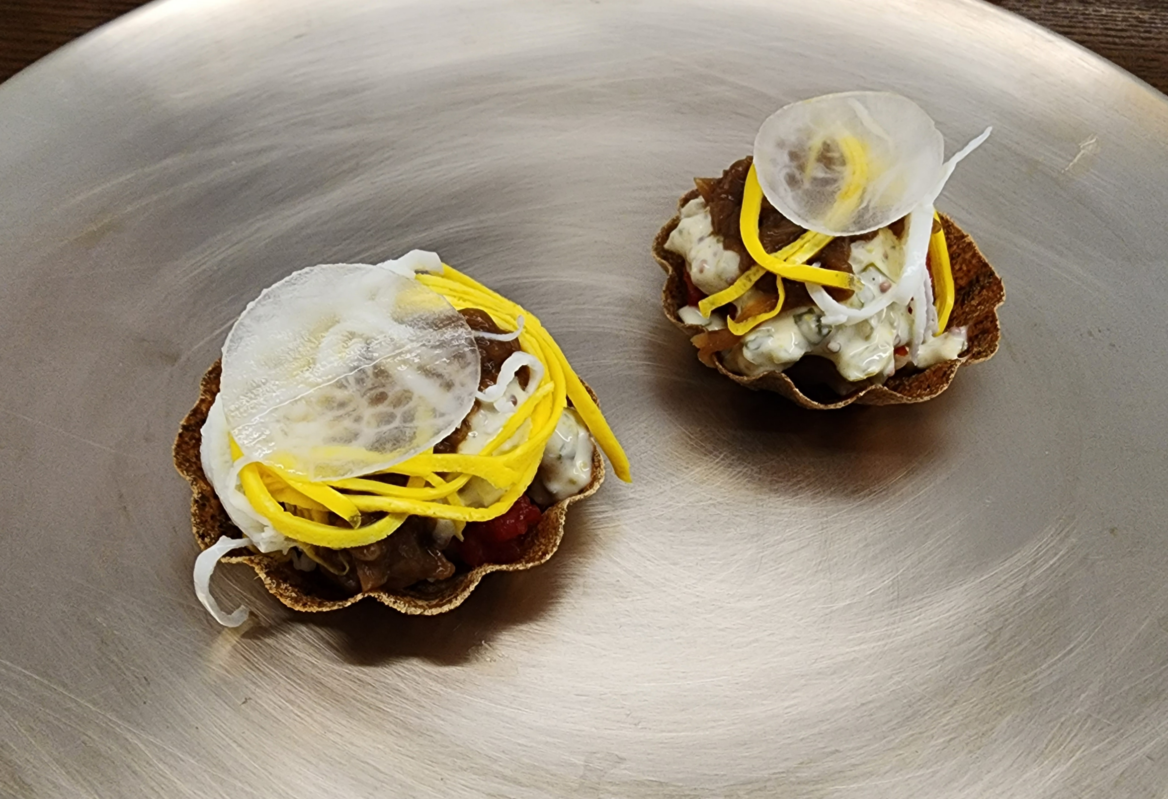 육회 비빔밥과 김 파네카라사우 타르트. 파네카라사우(Pane carasau)는 이탈리아 사르데냐주에서 만들어 먹는 평평한 빵이라고. 요즘 요수정의 스타터(혹은 아뮤즈 부셰)는 토핑만 바꿔서 요 스타일로 계속 나온다고 한다.