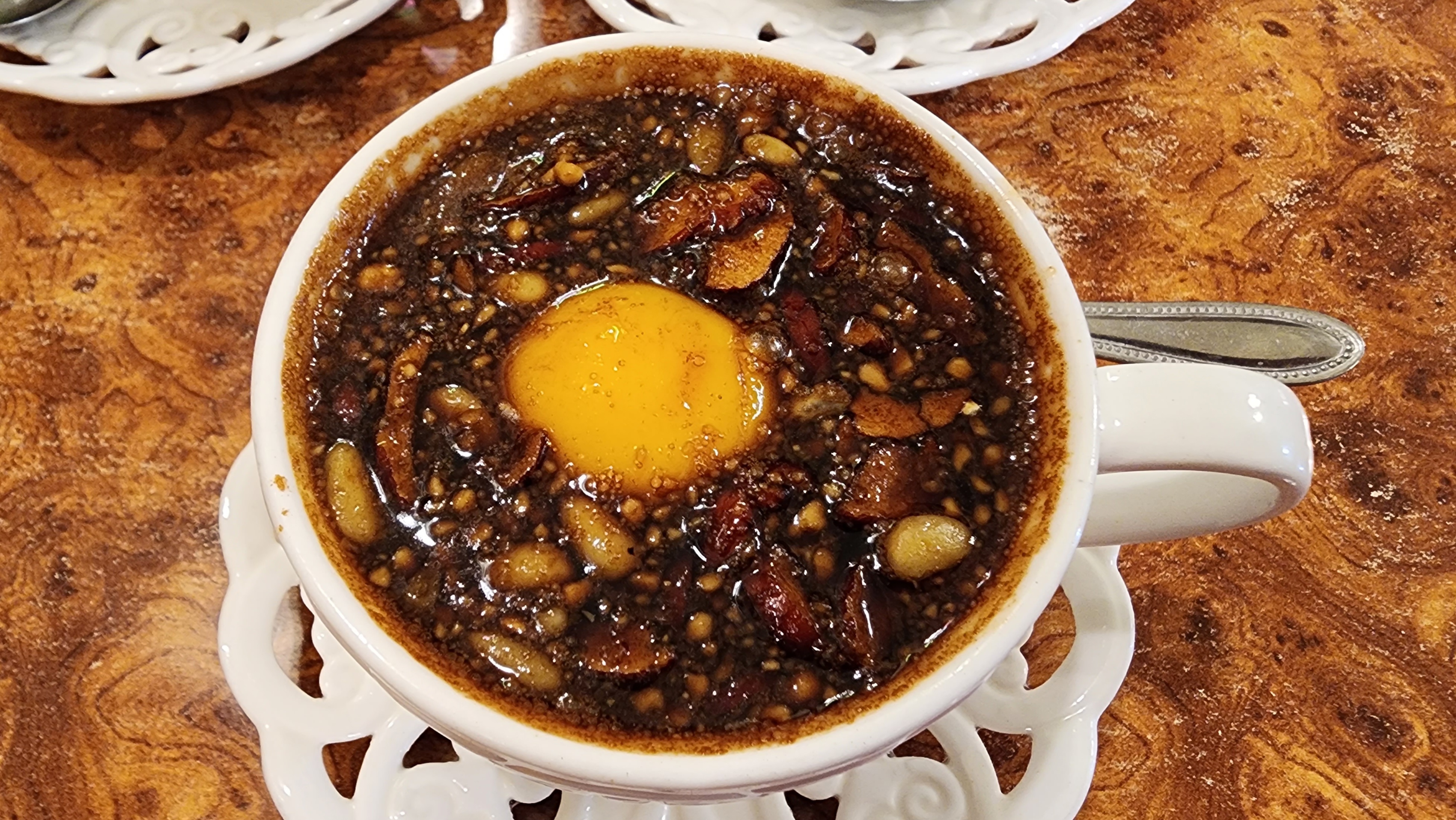 뜨거우니 데이지 않게 조심하라는 얘기를 여러 번 들었다. 그리고 계란 노른자를 요리조리 뒤집어 겉면을 살짝 익힌 후 터지지 않게 스푼으로 살짝 떠먹으면 맛있다고.