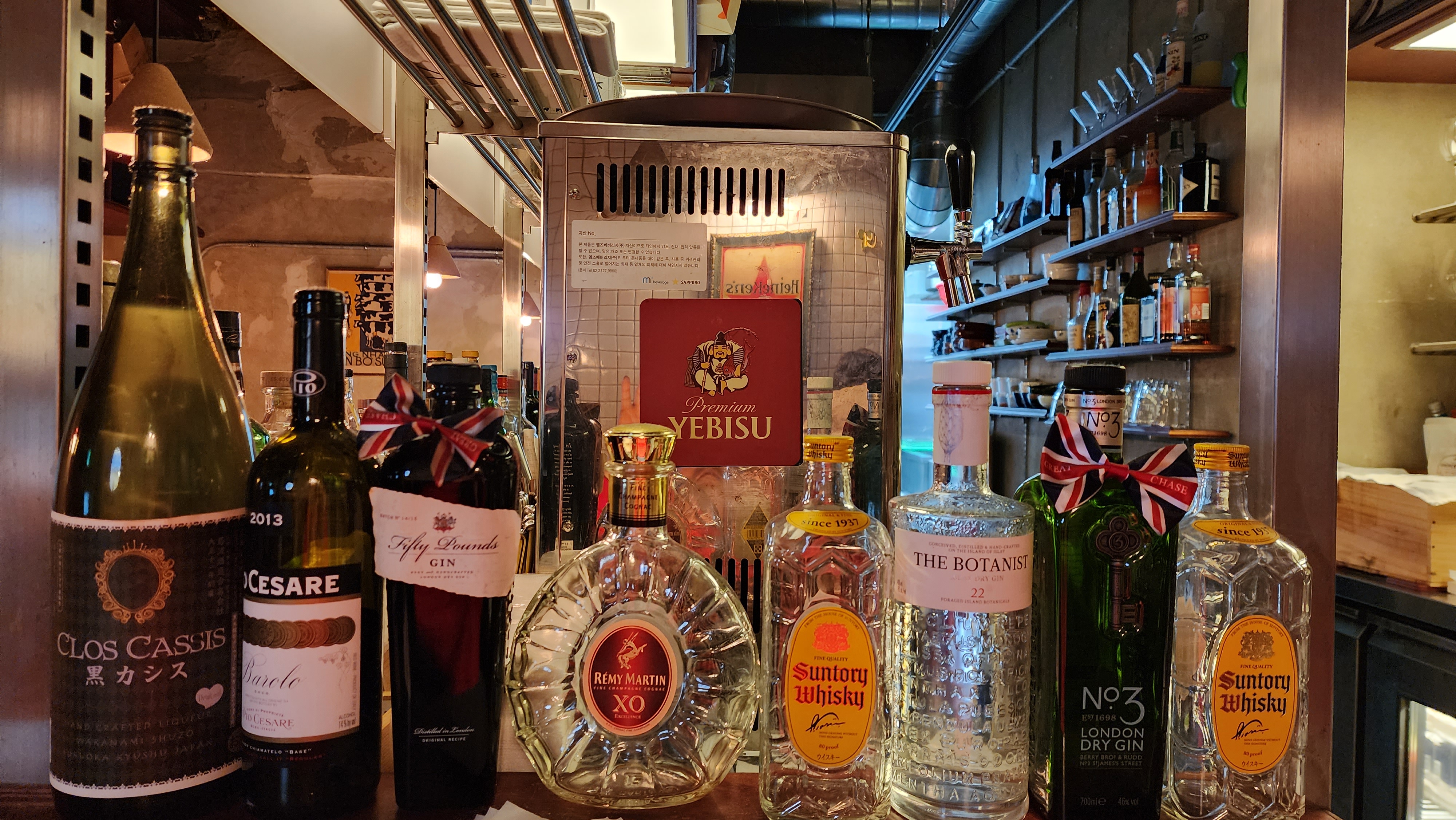 정면에 보이는 보틀들 사이의 에비스 생맥주 로고.