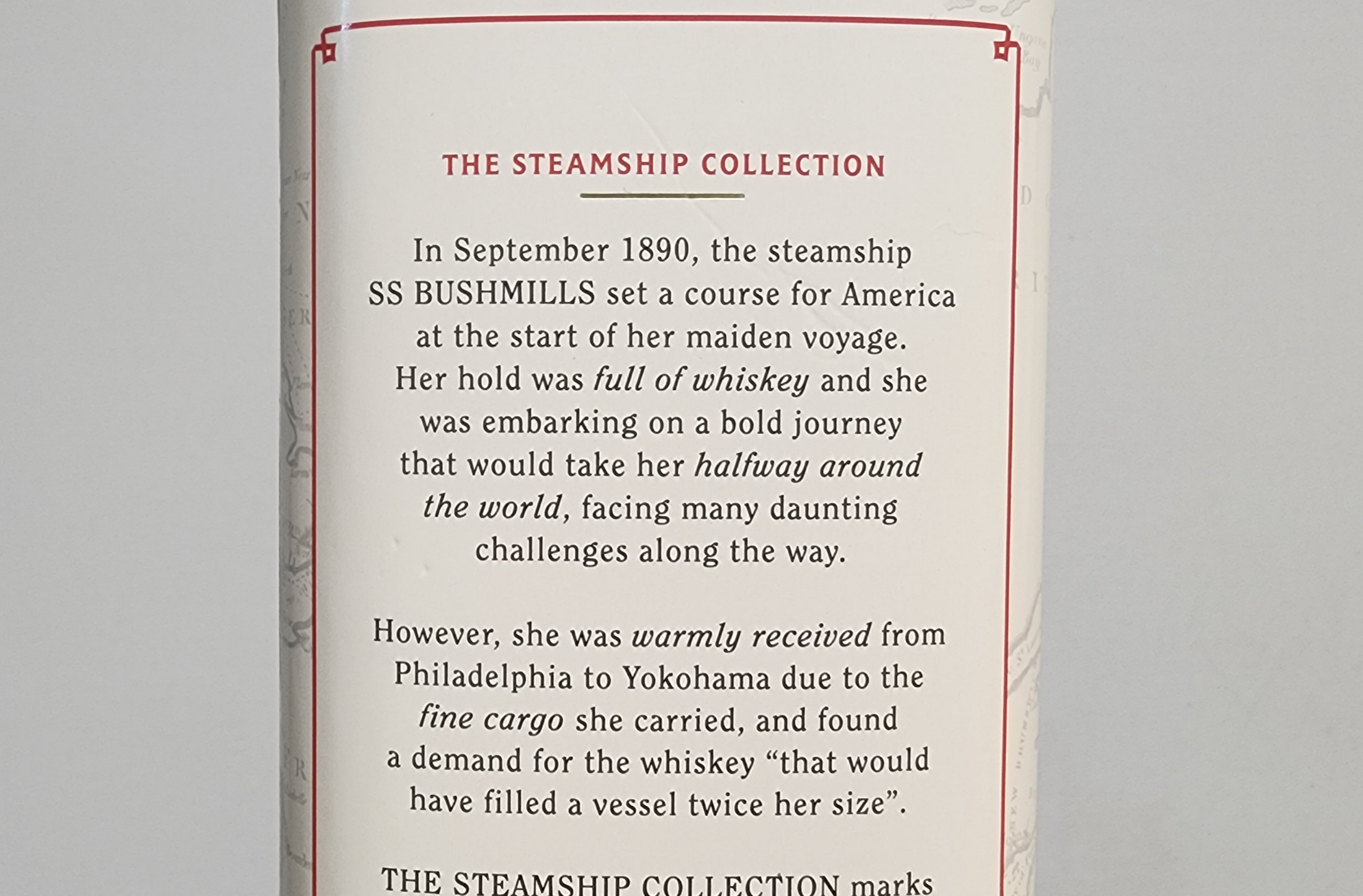더 스팁십 컬렉션(The Steamship Collection)은 1890년 미국 시장을 개척하기 위해 증기선에 부시밀즈를 싣고 첫 항해를 떠난 125주년을 기념하기 위해 출시한 제품이라고 한다.