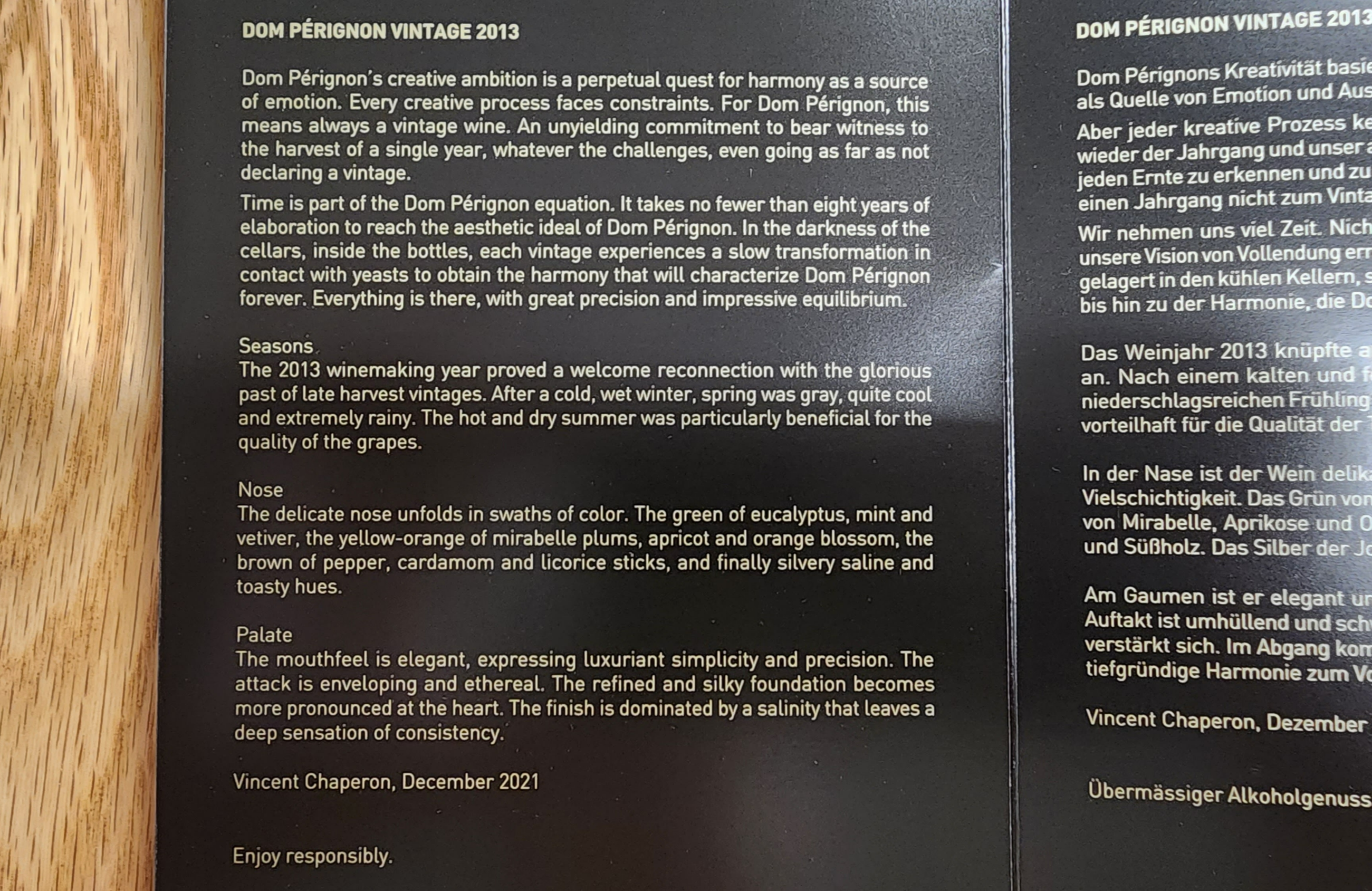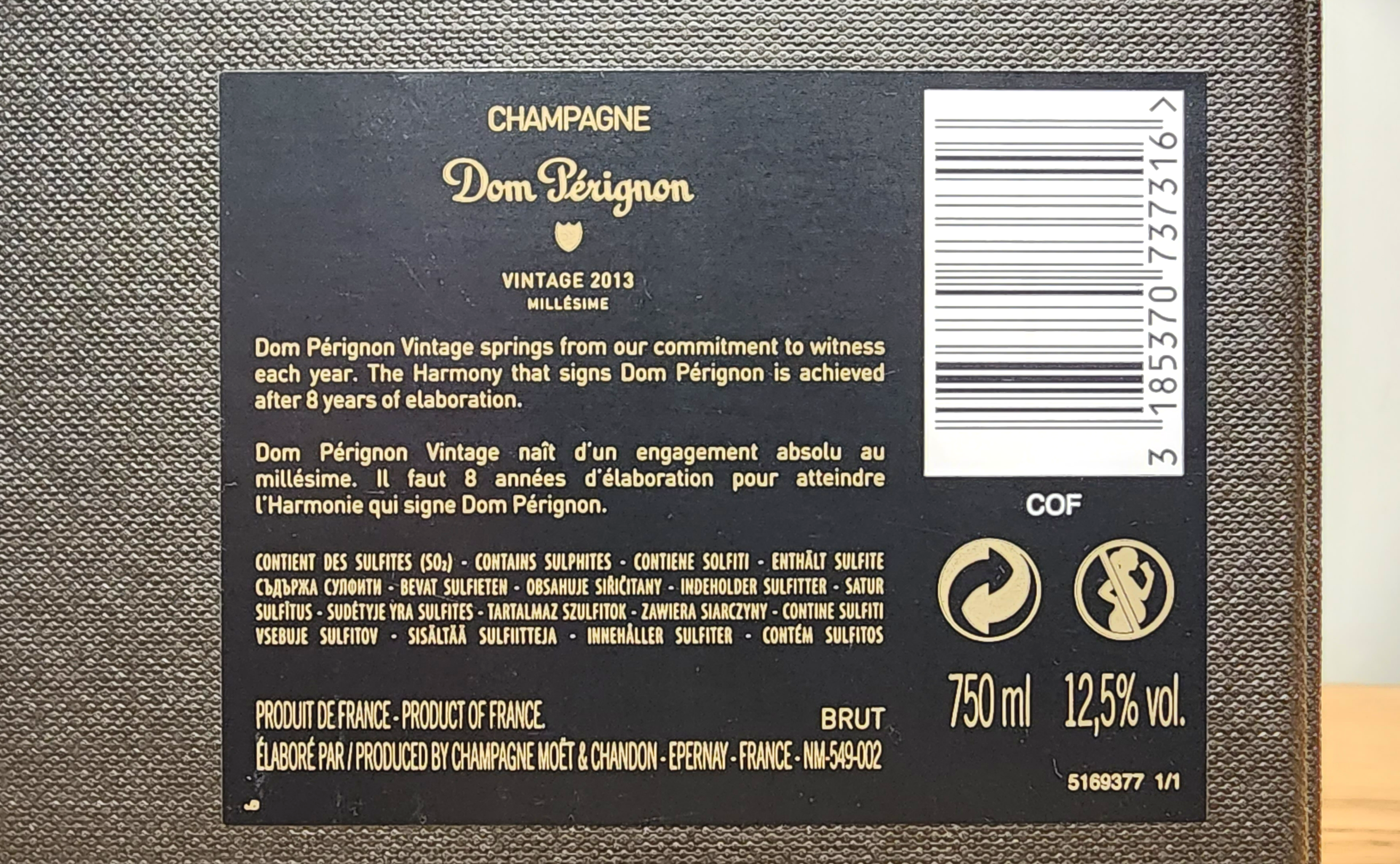 이미 딸냄 생빈 돔 페리뇽을 가지고 있었기에 아들빈도 살까 말까 고민하던 차에, 좋은 후배가 면세 구매 찬스를 준 덕분에 구입을 결정했다. 게다가 망빈이었던 2010년 빈티지에 비해, 2013년은 대부분의 매체가 샹파뉴 지역에 높은 점수를 줬다. 2023년 4월 기준 WA 95T, WS가 94(Drink or Hold)다. 베스트까지는 모르겠지만 최소 준척급 빈티지는 될 듯.