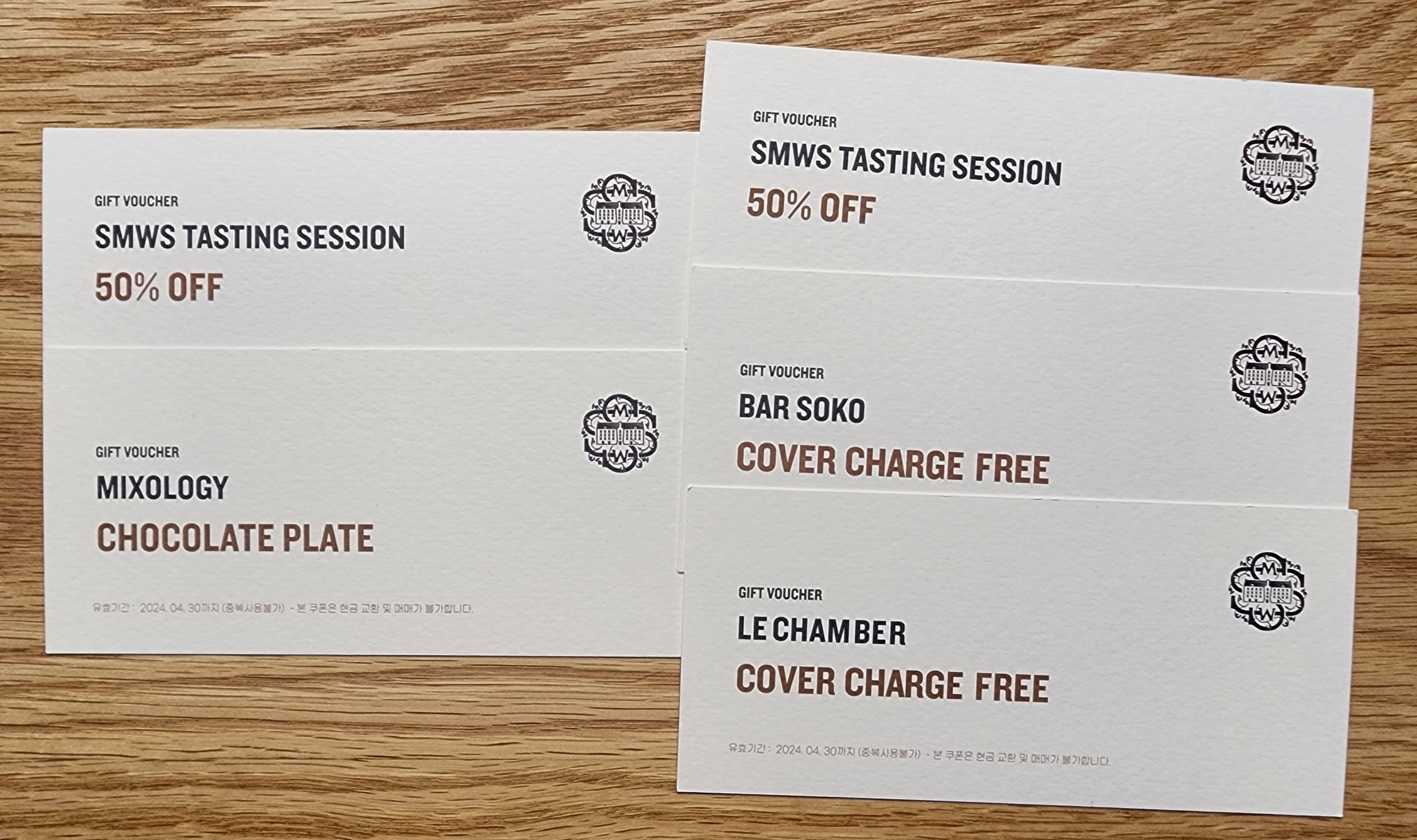 SMWS 테이스팅 세션 50% 할인 바우처가 2개, 파트너스 바에서 쓸 수 있는 바우처 3장.
