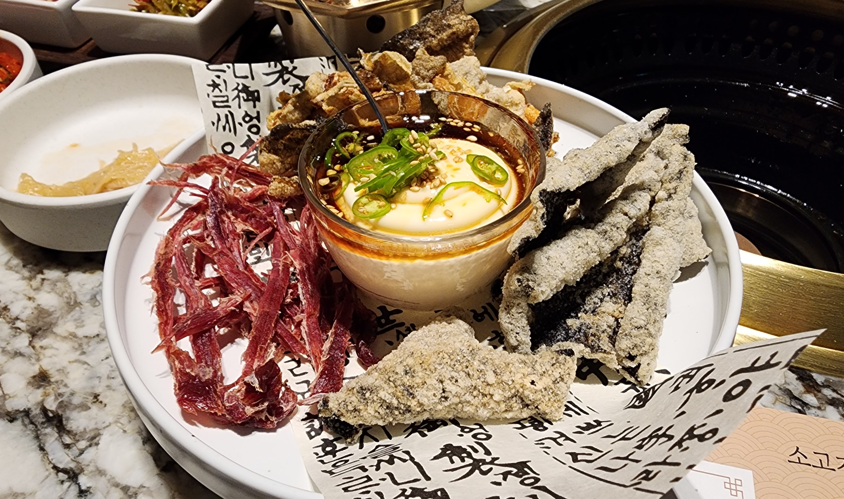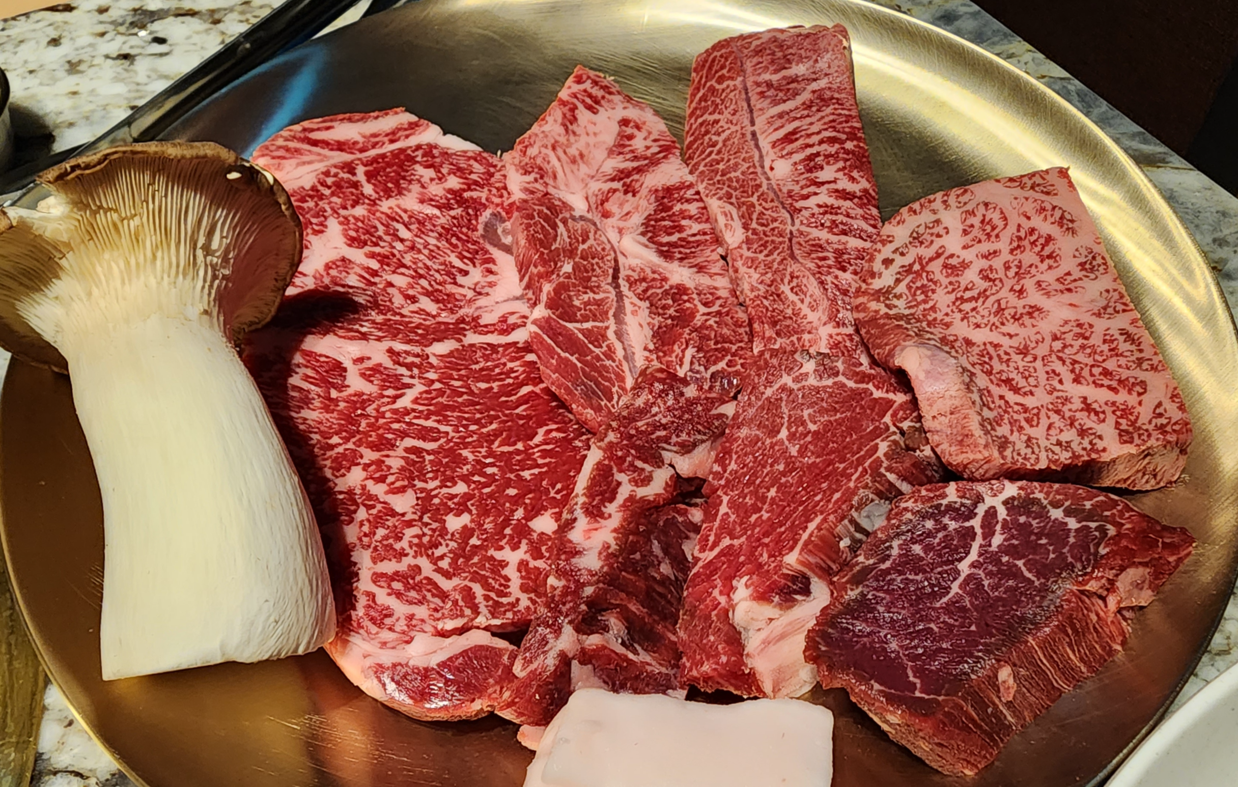하지만 메인은 당연히 한우. 명품 모둠을 시킬까 하다가 처음이니 일단 기본 먼저 먹어보자는 생각에 소 한 마리를 선택했다. 등심을 기본으로 특수부위와 육회가 같이 나오는 듯.