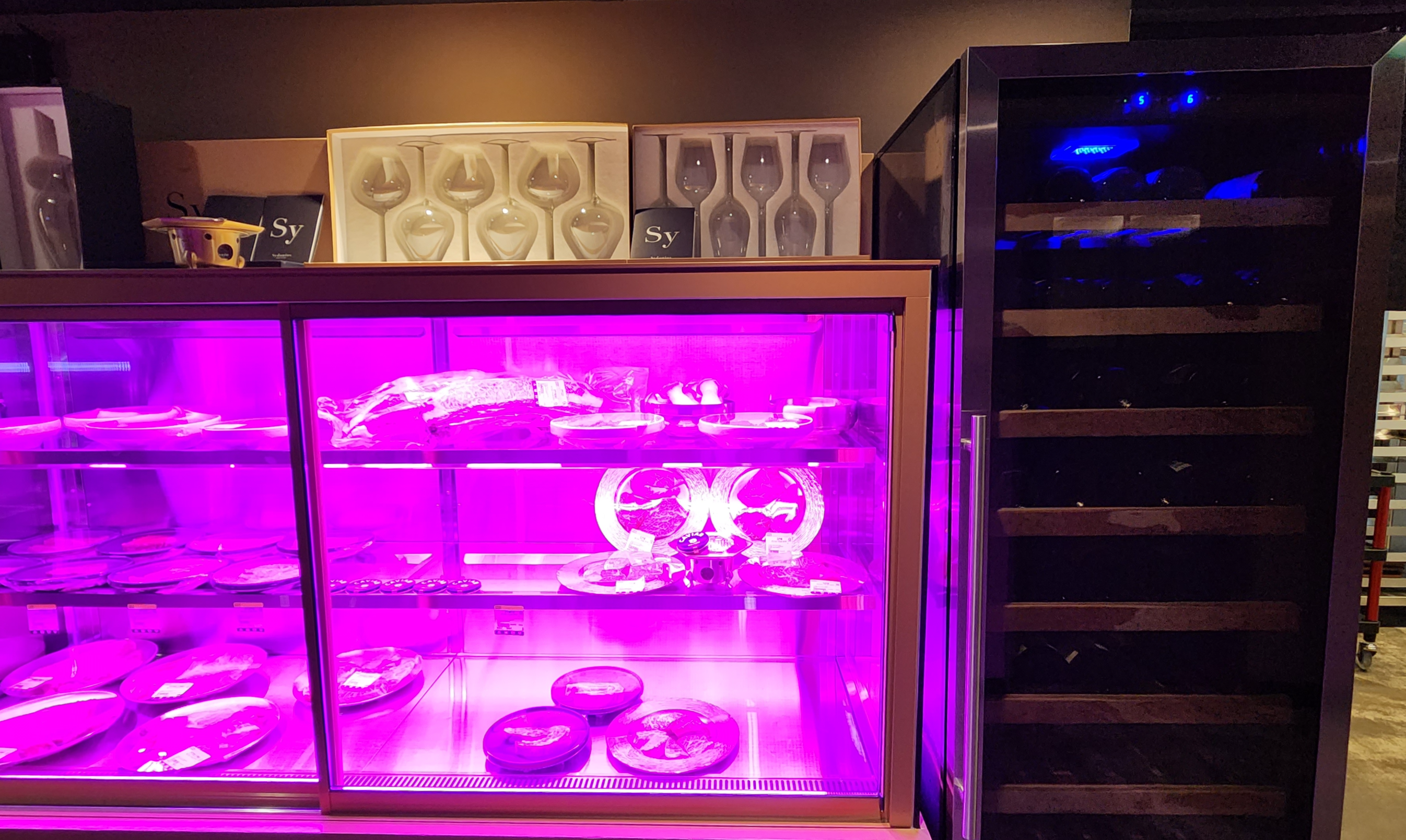 안쪽에는 와인 셀러와 숙성 한우 냉장고, 그리고 그 위에 고급진 글라스가 진열돼 있다.
