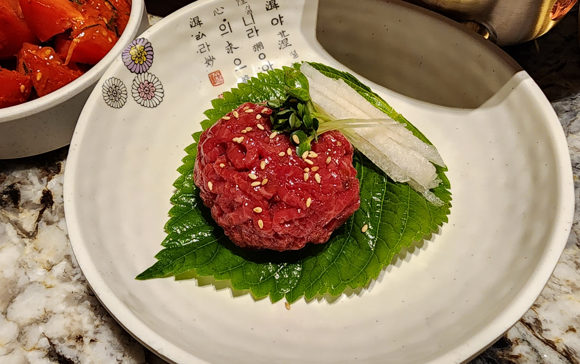 한우 육회. 마블링이 잔잔히 섞여있는, 좋아하는 스타일의 육회다.