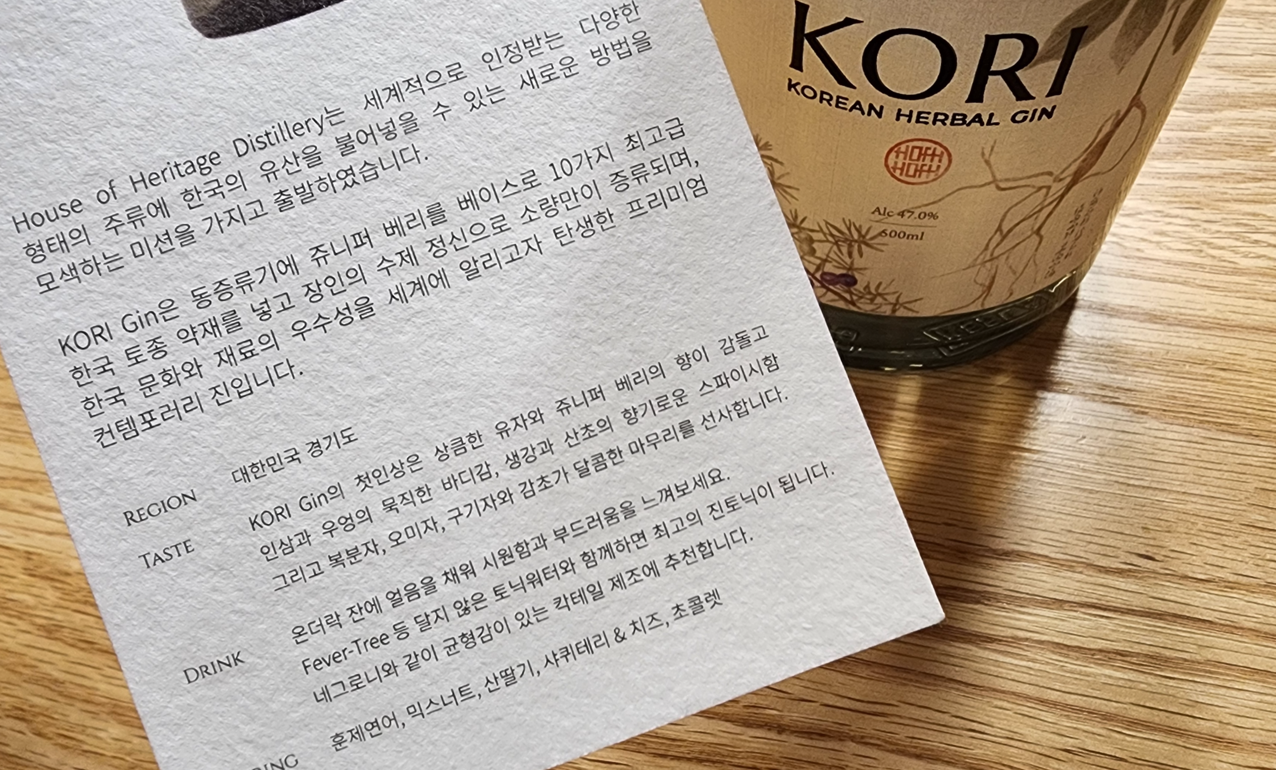 병 모양도 귀엽고 레이블도 상당히 단아한 것이 마음에 든다. 병 모양은 원래 진이 약용으로 사용되던 것에 착안해 영국에서 진을 담던 약병의 모양을 차용했다고. 레이블은 마 원단을 사용했고, 거기에 대표적인 재료인 주니퍼 베리와 인삼을 그려 넣었다. 코르크 또한 천연연 코르크를 사용했다고 한다.