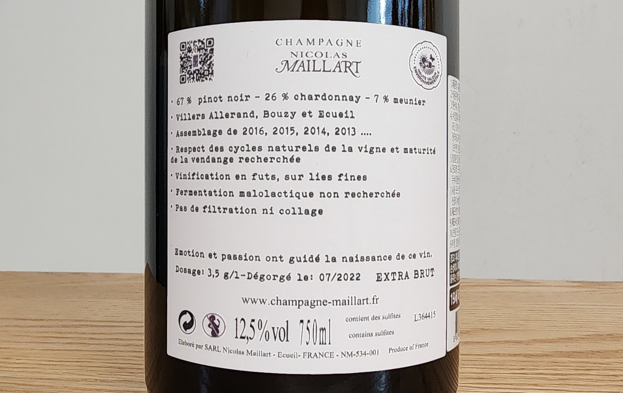 빌레 알레렁(Villers Allerand), 에퀼(Ecueil) 프르미에 크뤼와 부지(Vouzy) 그랑 크뤼의 포도를 사용하며 품종 비율은 피노 누아(Pinot Noir) 67%, 샤르도네(Chardonnay) 26, 피노 뫼니에(Pinot Meunier) 7%. 2013, 2014,2015, 2016년 빈티지를 블렌딩 했다. 발효는 나무통에서 효모 잔여물과 함께(sur lies) 진행하며 젖산 발효는 하지 않는다. 데고르주멍은 22년 7월에 진행했으니 제법 긴 숙성 기간을 거친 셈이다. 도자주는 리터 당 3.5g. 알코올 12.5%.