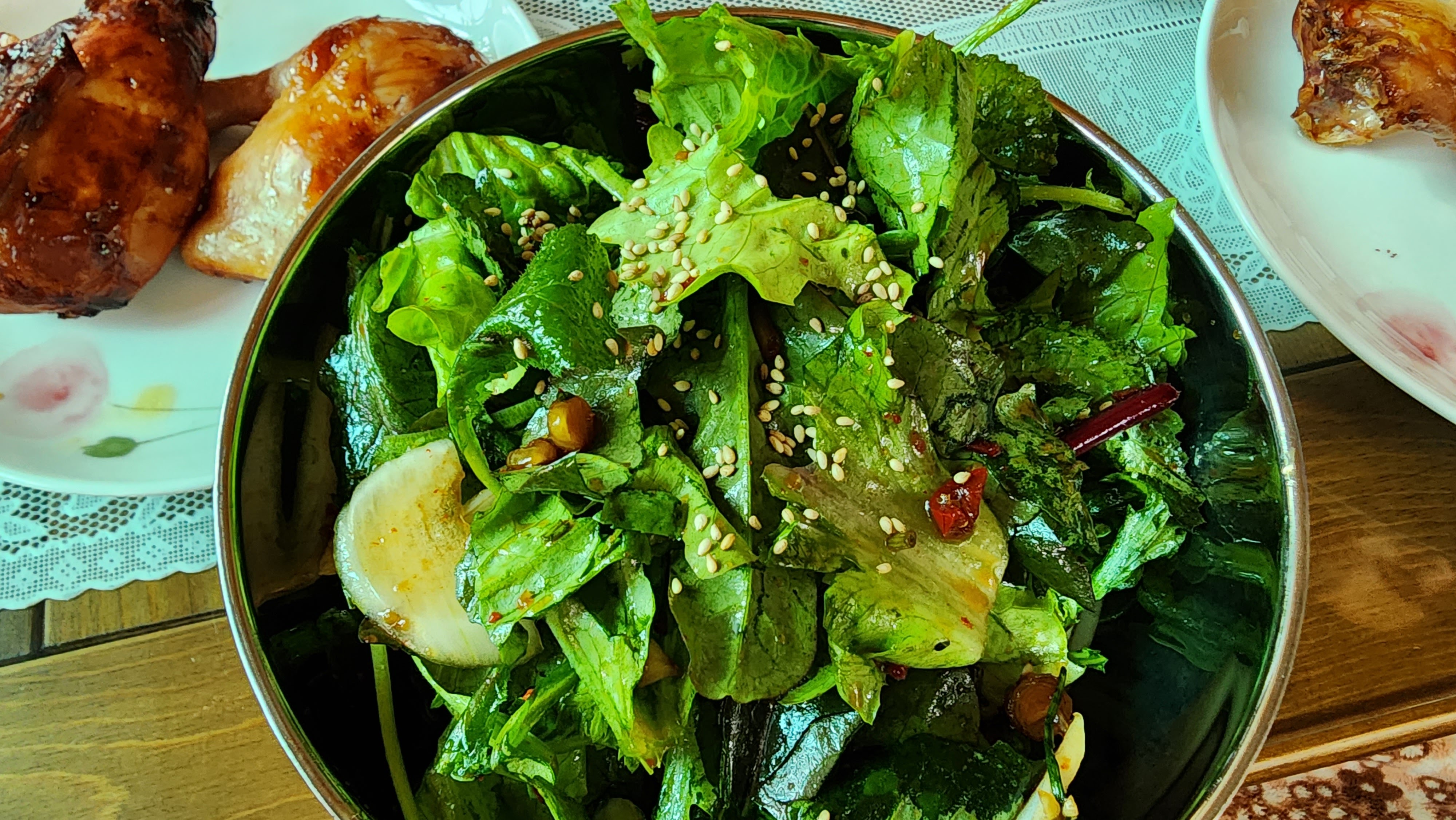 가니시는 텃밭에서 방금 잘라 온 어린잎 샐러드.