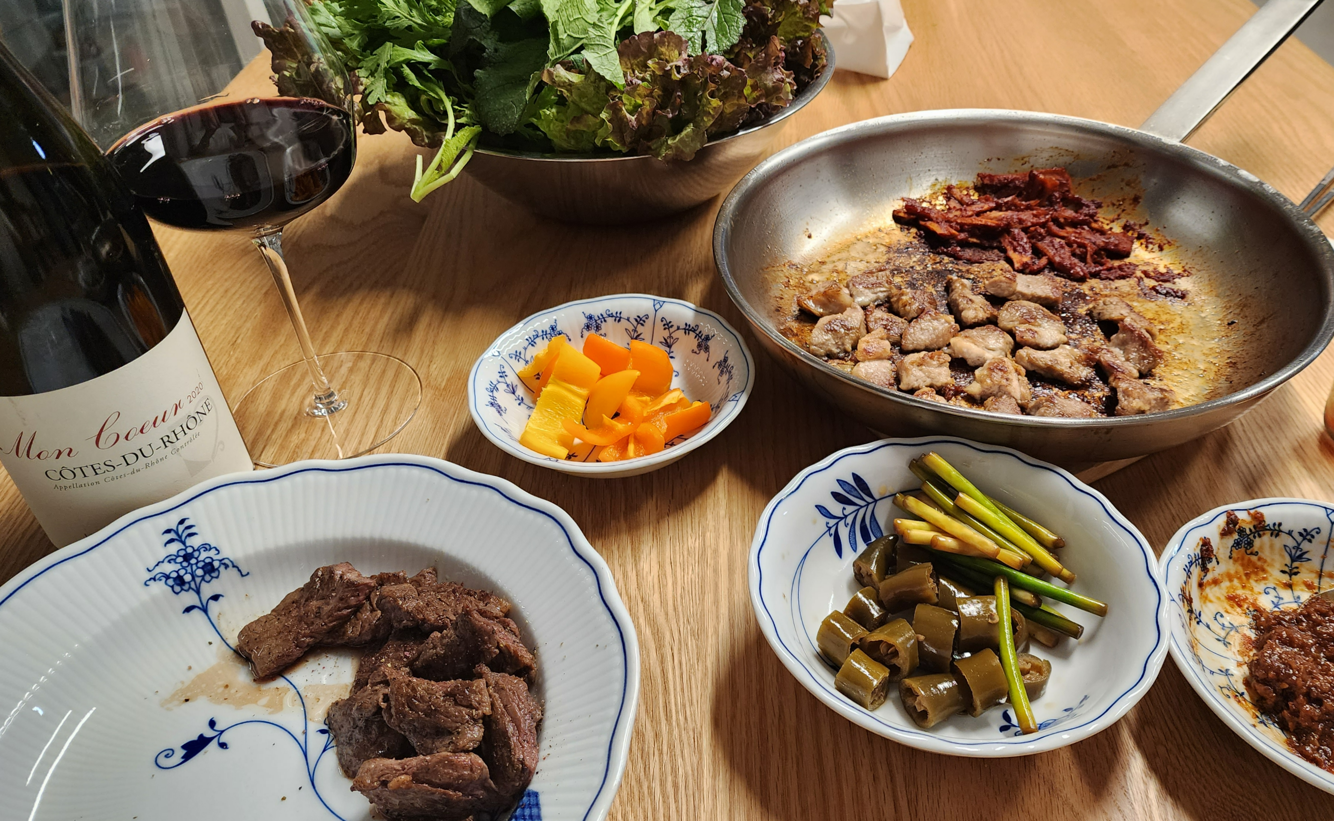소고기와 돼지고기의 콜라보 밥상. 연이틀 와인을 마셨지만 이런 조합이면 못 참지.