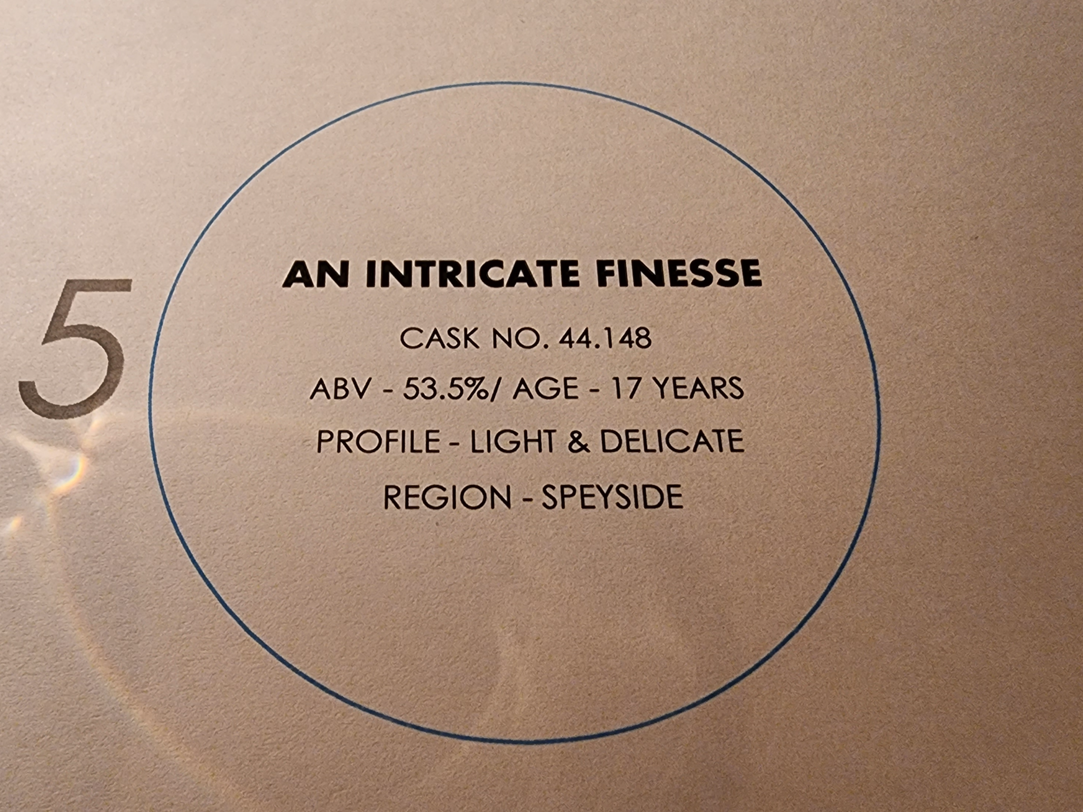 5번, AN INTRICATE FINESSE(44.148). 알코올 53.5%, 17년 숙성, Speyside, light & delicate.