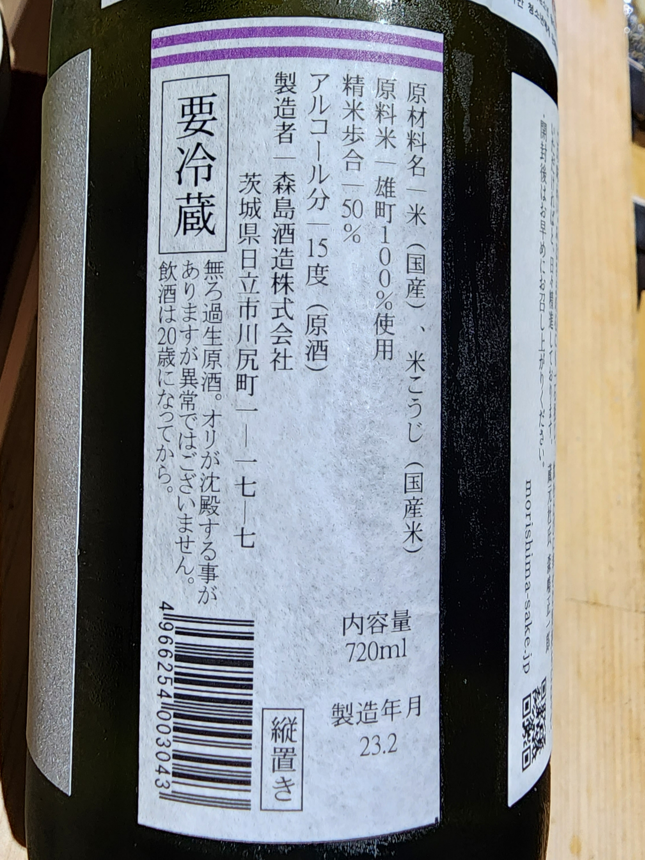 도정이 어려워서인지 정미보합은 딱 50%. 알코올 함량은 15%. 무로카나마겐슈(無濾過原酒生酒)다.