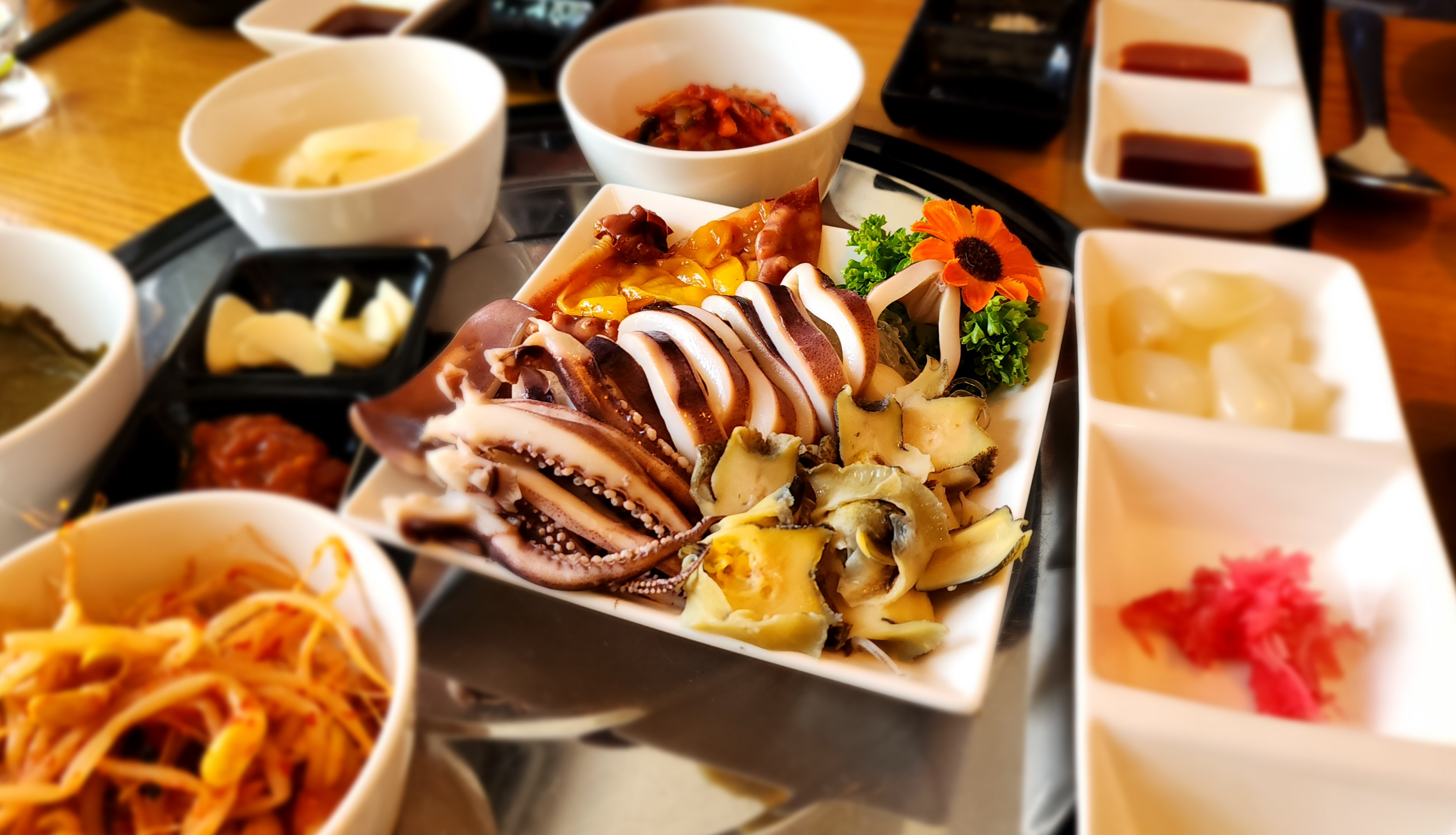 멍게, 데친 오징어와 뿔소라. 이게 기본 안주다. ㅎㅎㅎ