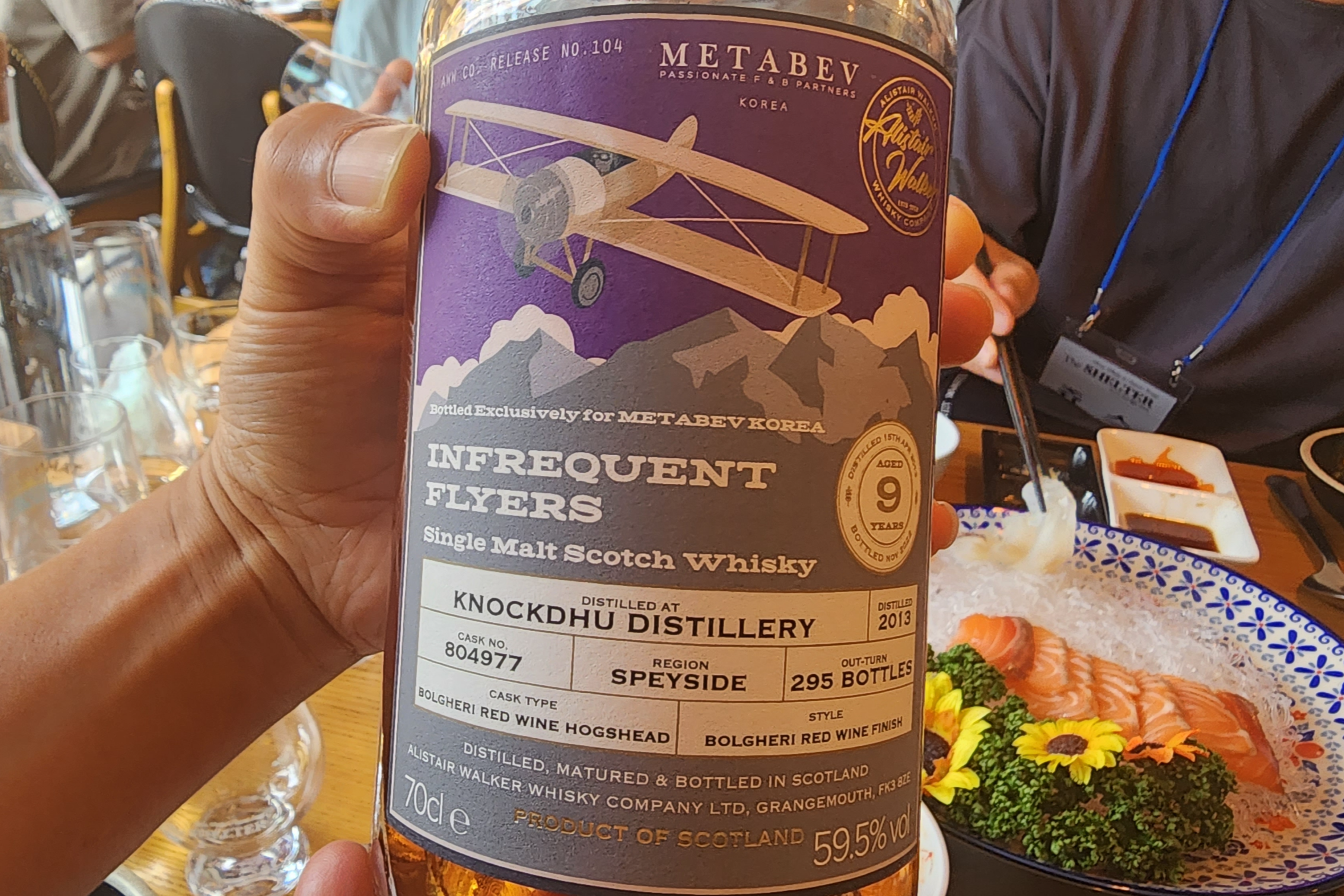 Infrequent Flyers, Knockdhu 2013 9 yo. 궁금했던 독병. 와이니한 뉘앙스에 완숙 자두 풍미가 가볍게. 입에서는 곡물 풍미와 함께 뭔가 쉰 과일 향 같은 뉘앙스가 살짝. 코에서는 제법 좋았는데 입에서 아쉬웠던. 옆자리 분은 최애로 꼽을 만큼 좋아하셨는데 내 취향은 아니었음. 살까 말까 고민하던 보틀이었는데 안 사도 될 것 같다.