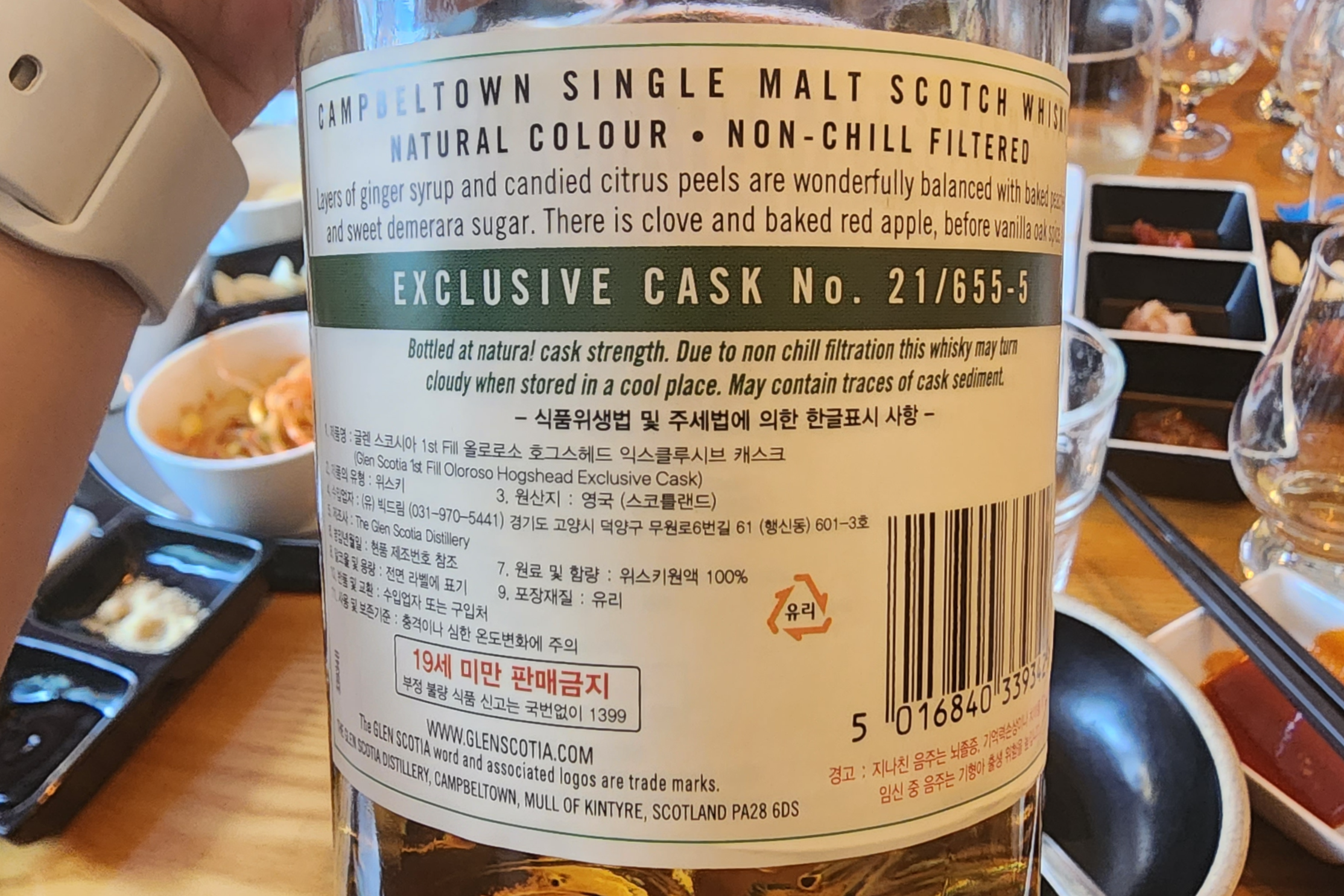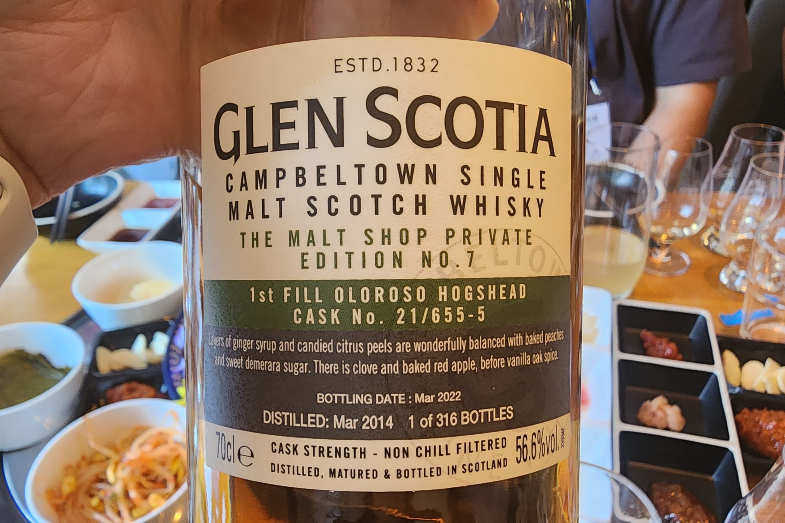 대피소 캐스크인 줄 알았는데 아니었던 글렌 스코샤. 몰트샵 에디션이었다. Glen Scotia, 1st Fill Oloroso Hogshead Cask No. 21/655-5. 완전 톡 쏘는 후추와 강렬한 스파이스, 날 선 버번 같은 느낌인데 퍼필 올로 셰리... 그런데 시간이 지날수록 향긋한 과일향이 예쁘게 살아나기는 한다. 이날 대피소 캐스크는 자두 같은 과일, 스모키, 둥글고 부드러운 바디감이 느껴졌는데 상당한 차이가 느껴졌다는.