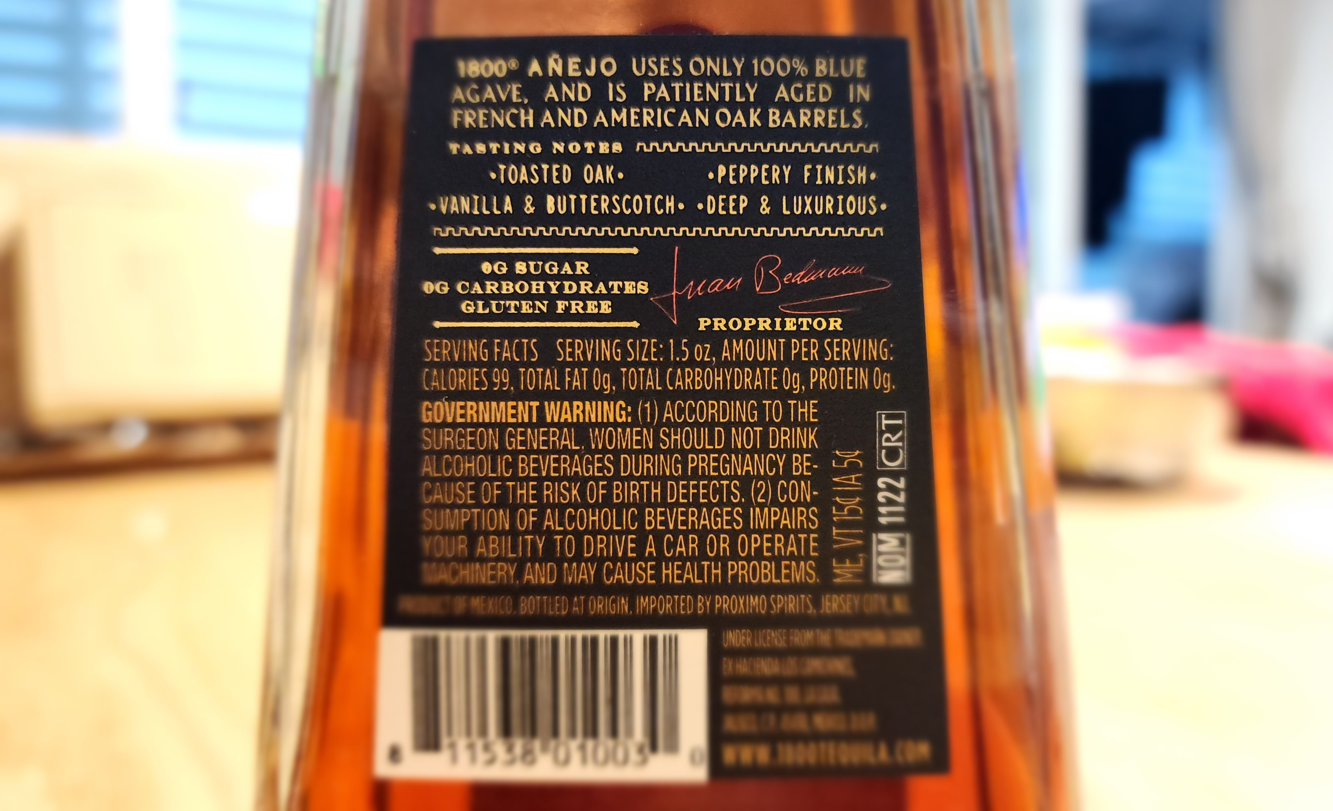 홈텐딩용으로 구입한 두 번째 테킬라, 1800 아네호(1800 Añejo). Añejo의 발음은 '아녜호'에 가까운데, 국내에서는 아네호로 표기하는 경우가 더 많은 것 같다.