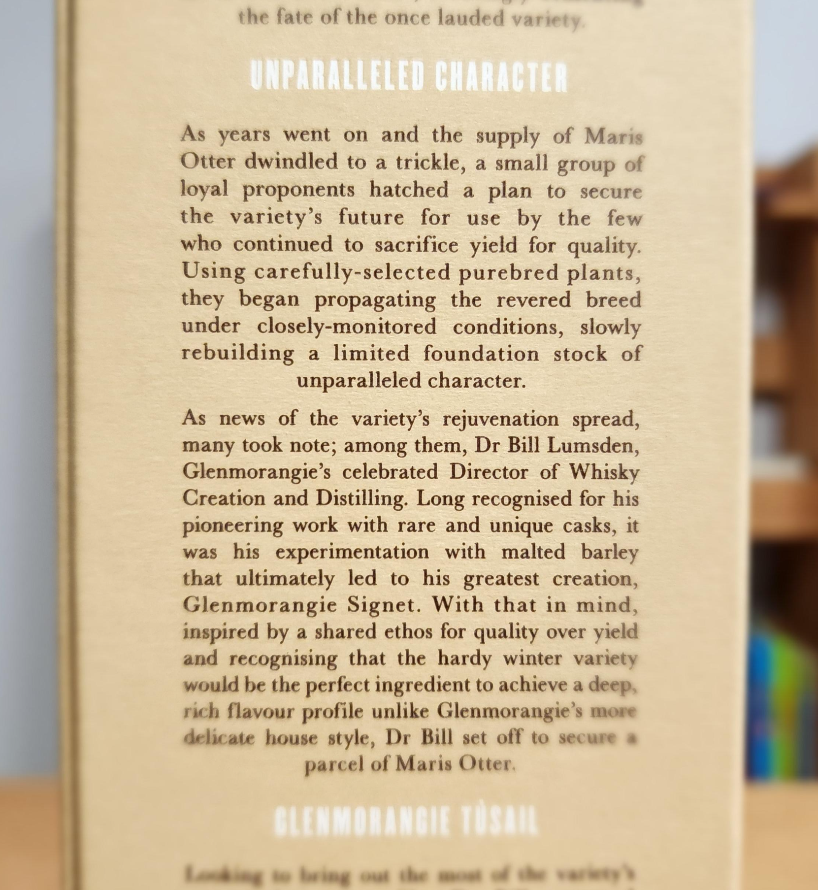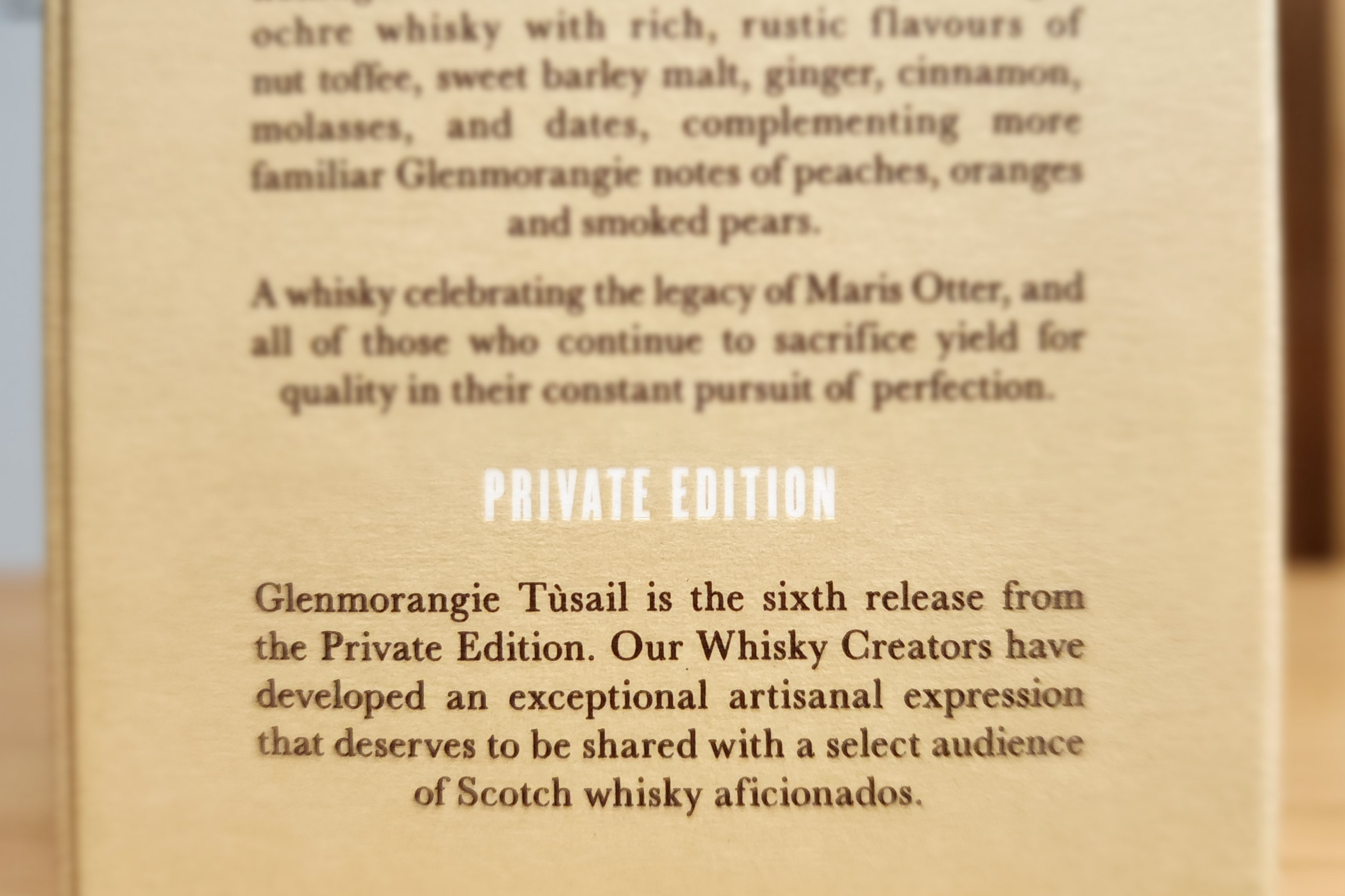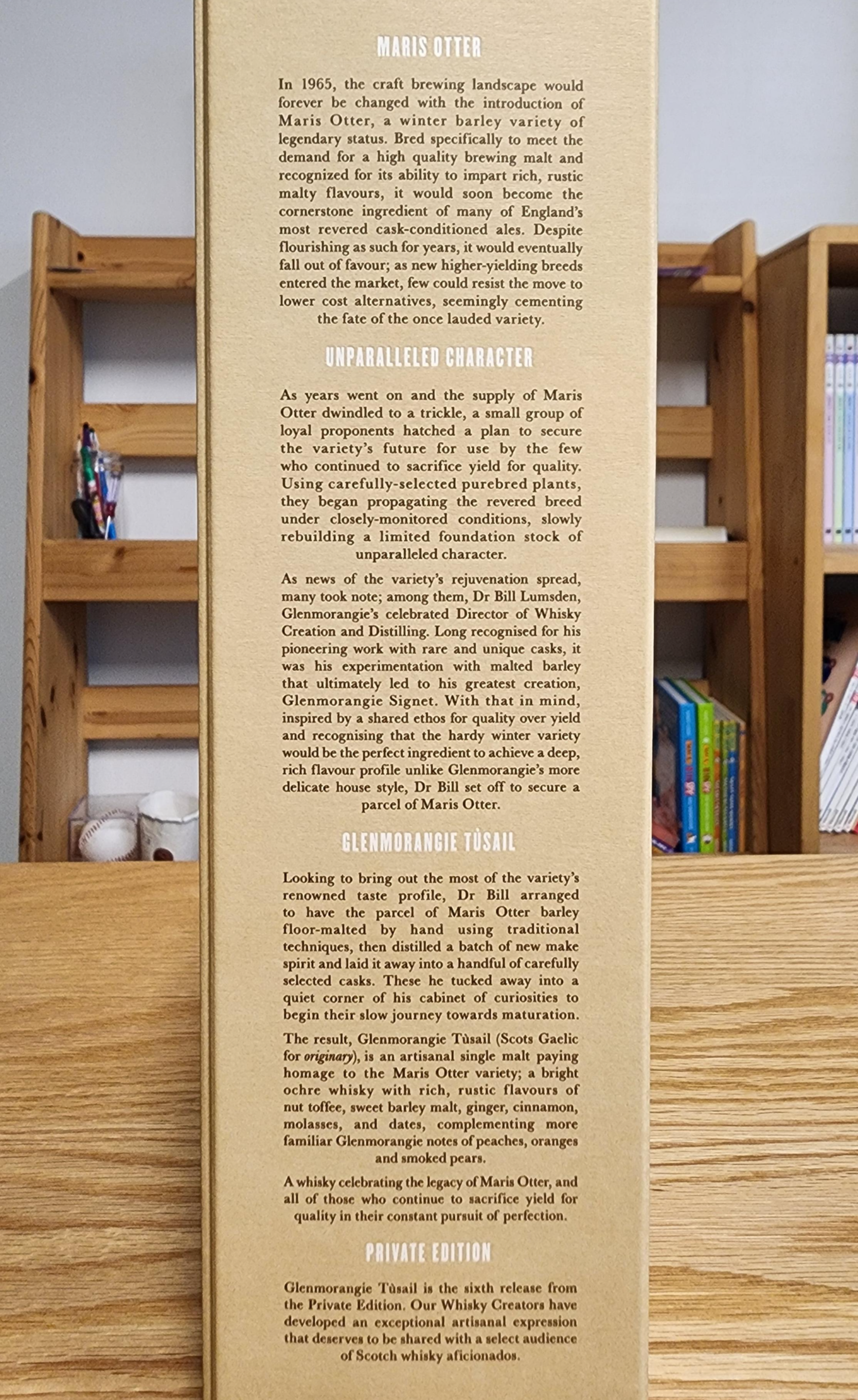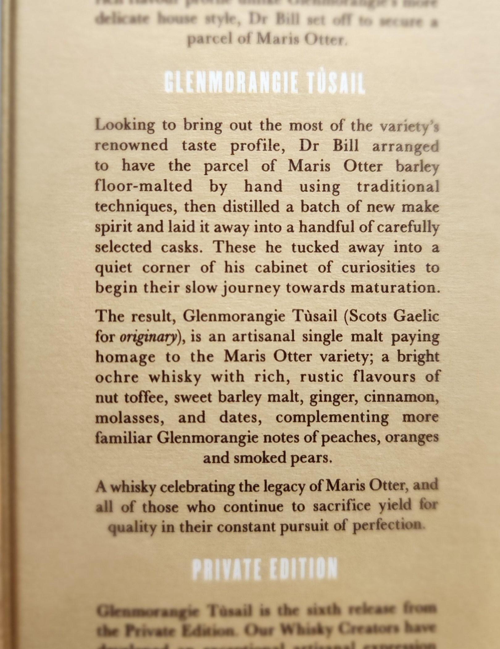 2012년부터 매년 출시한 글렌모렌지 프라이빗 에디션(Glenmorangie Private Edition)의 여섯 번째 위스키, 투세일(Tùsail). 프라이빗 에디션는 특별한 몰트 혹은 캐스크를 사용해 만드는 위스키다. NAS인데 숙성 기간은 오리지널과 유사한 10년 전후이지 않을까 싶은.