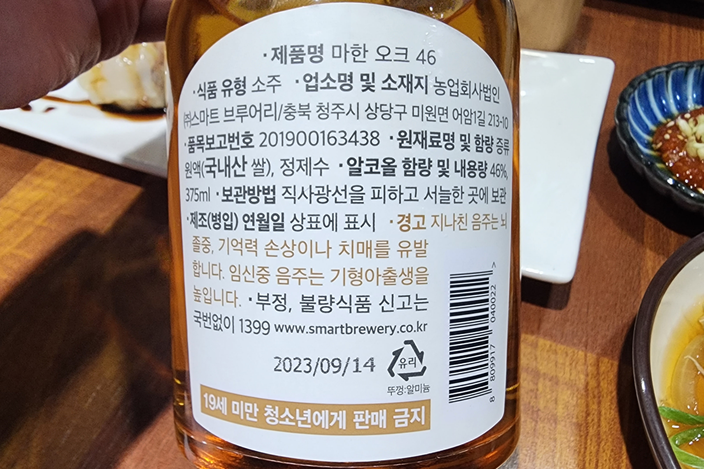 마한 오크 46도. 고급 오크를 사용하시는 듯 깔끔한 풍미가 일품이다. 특히 멍게랑 아주 잘 어울렸음.