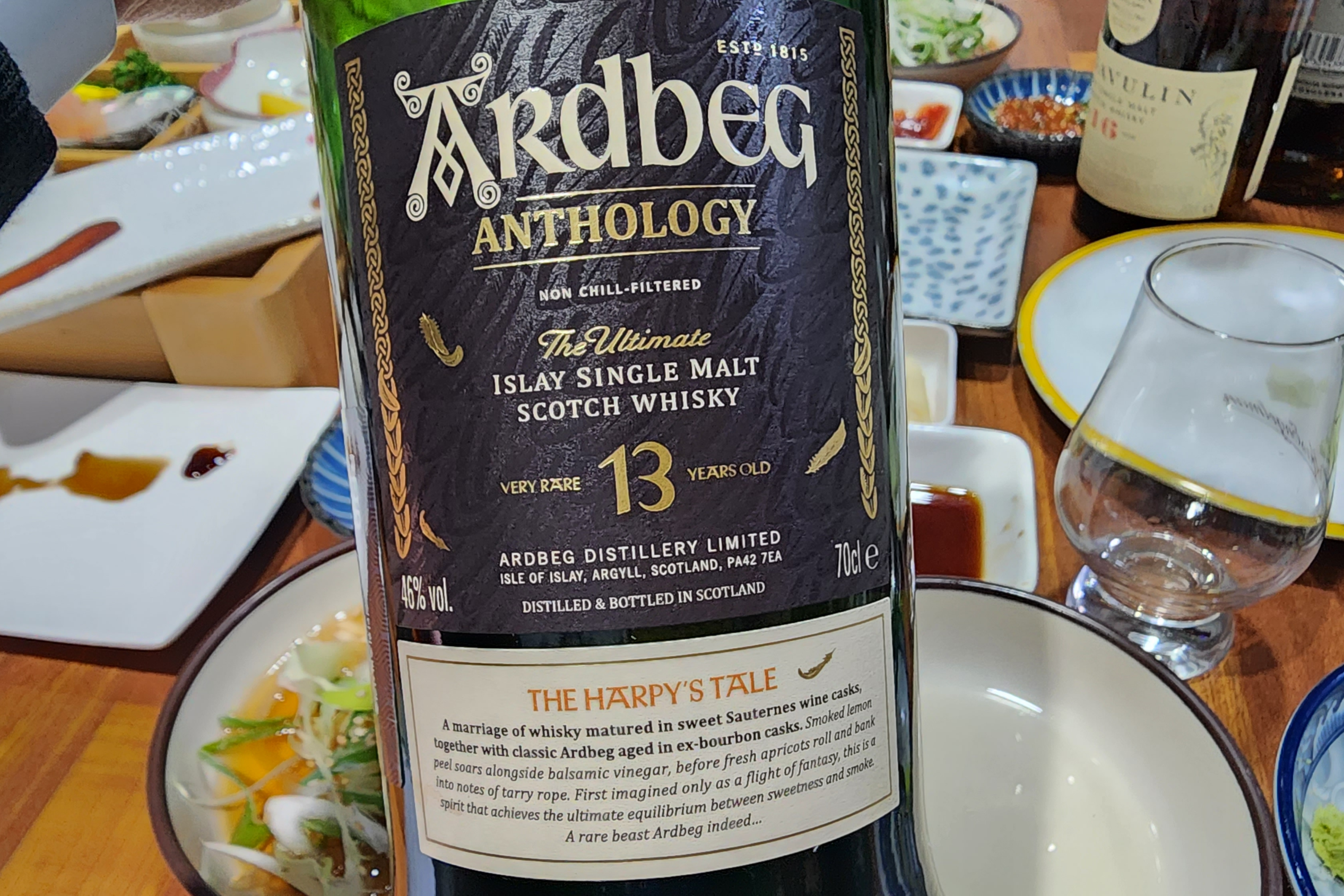 Ardbeg, Anthology 13 yo. 아드벡스럽지 않게 가볍고 은은한, 존재감을 드러내지 않는 피트. 약재 뉘앙스가 감도는데 입에서는 오묘하게 담뱃재가 연상됐다. (그렇다고 역하다는 얘기는 아니지만...) 달달한 느낌이 거의 없고, 화한 민트 힌트, 오레가노 등 허브 뉘앙스가 강한 것 같다. 기대와는 전혀 다른 스타일.
