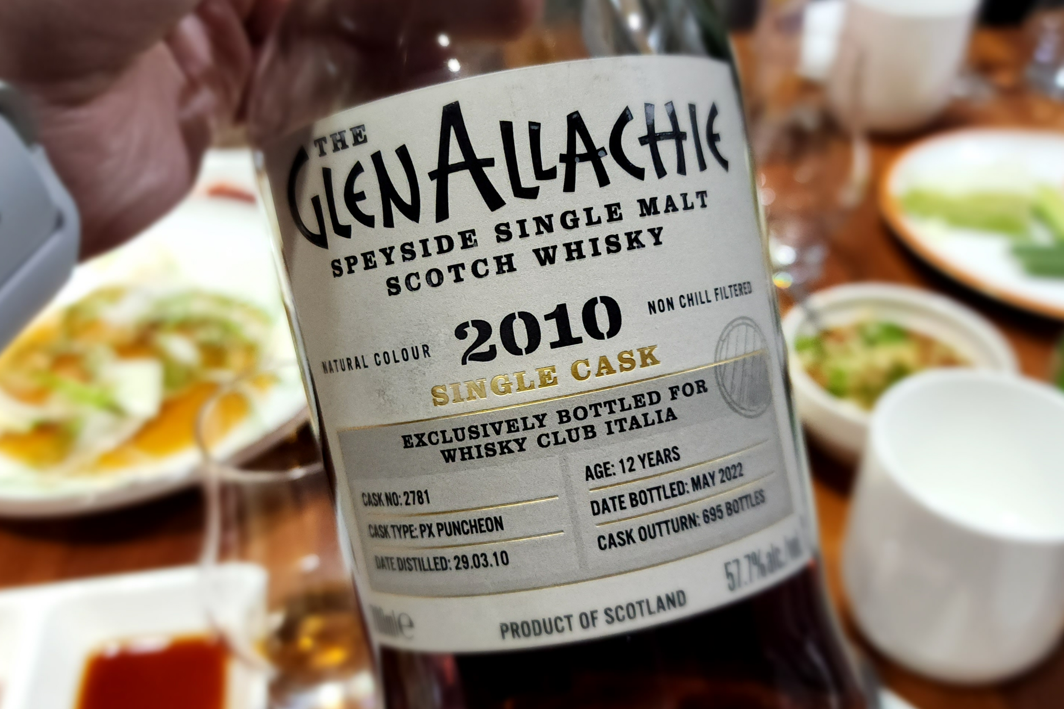 GlenAllachie, 2010 Single Cask for Whisky Club Italia. 진한 간장, 꾸덕함, 건포도, 호두 같은 고소한 견과, 그리고 향긋한 꽃향기가 은근하게. 입에서는 검붉은 베리가 밀도 높게 드러난다. 과연, PX 펀천에서 12년 숙성한 CS 답다.