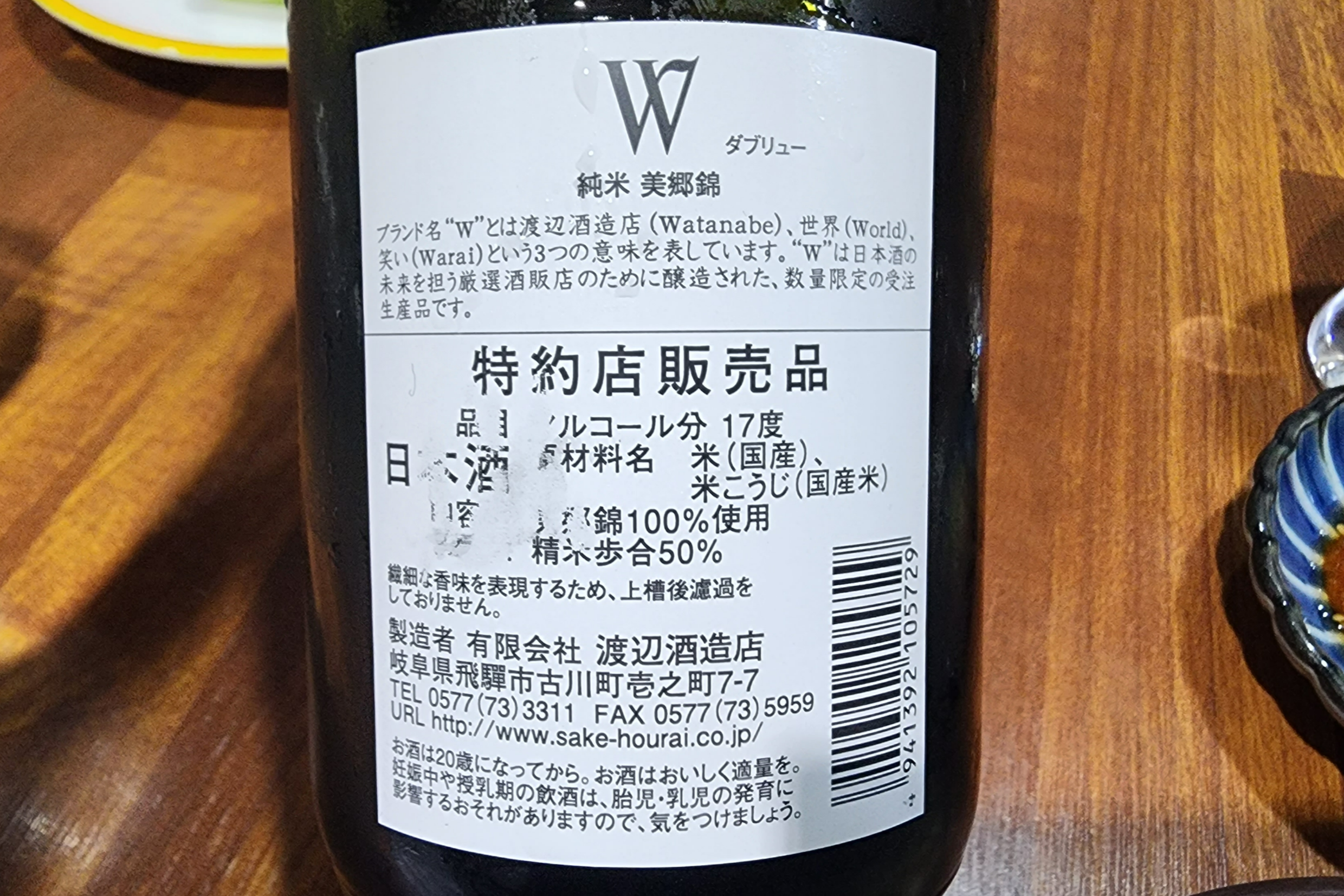 일부 판매점에만 들어가는 한정판인 듯. 정미보합 50%니까 준마이 다이긴조 급인데 굳이 표시도 하지 않았다. 미사토니시키(美郷錦)는 야마다니시키(山田錦)와 미야미니시키(美山錦)를 교배해서 만든 품종이라고. 와나나베 슈조(渡辺酒造)는 1870년 기후현(岐阜県)에 설립한 양조장이다. 브랜드인 W는 와타나베 슈조, 세계(World), 웃음(笑, Warai)의 이니셜을 딴 것이라고.
