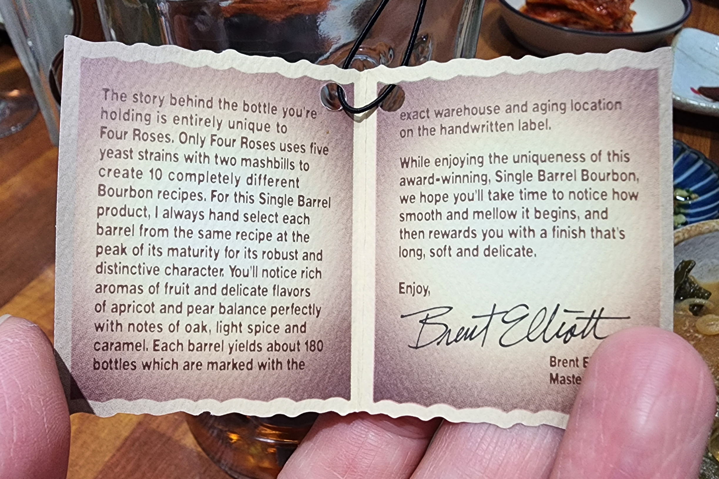 이번에는 버번 2종을 함께. Old Ezra 12 yo. 일본에서 온 보틀이다. 웜 스파이스와 함께 달달한 과일 풍미가 확연하게 드러나며, 그린 허브와 톡 쏘는 스파이스, 토스티 바닐라 뉘앙스가 균형을 이룬다. Four Roses Single Barrel RN 15.4Q는 노란 꽃, 에나멜, 캐러멜 등이 비교적 가볍고 섬세하게 드러난다. 개성이 확연히 다른데, 원래 좋아하는 스타일은 포 로지즈에 가깝지만, 이날은 올드 에즈라 12년이 더 좋았다. 마지막 즈음이라 볼륨감이 있고 캐릭터가 진하고 명확한 게 더 마음에 들었던 듯.